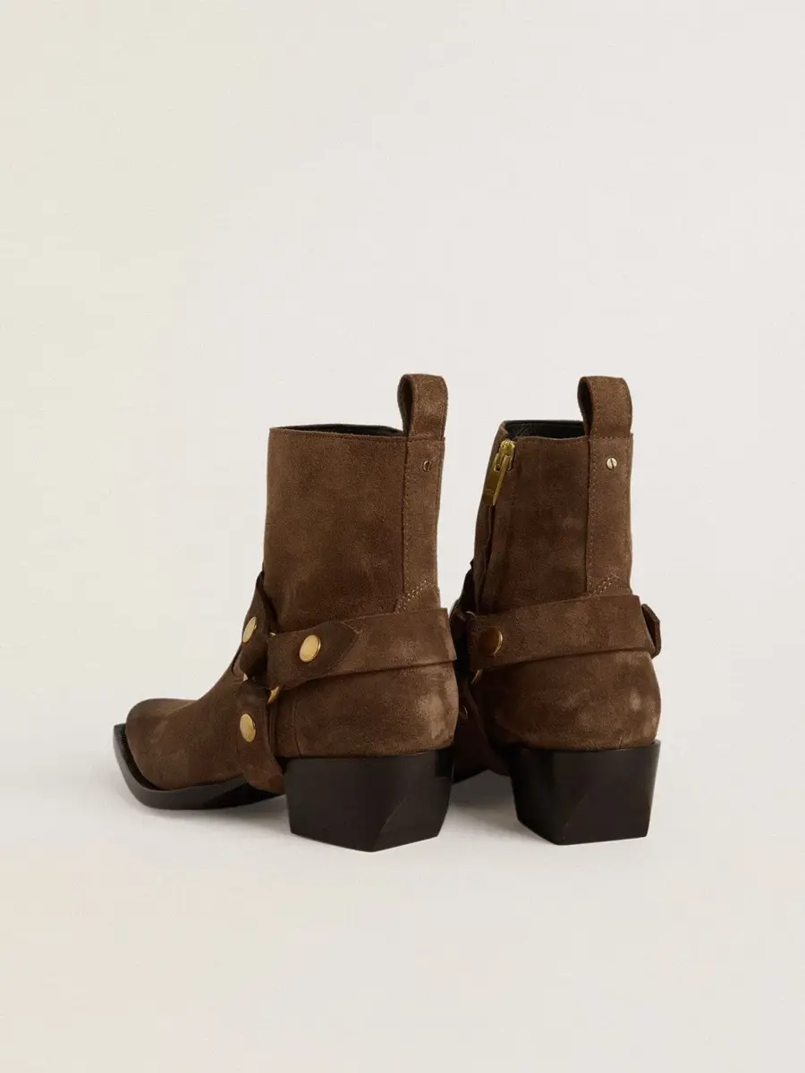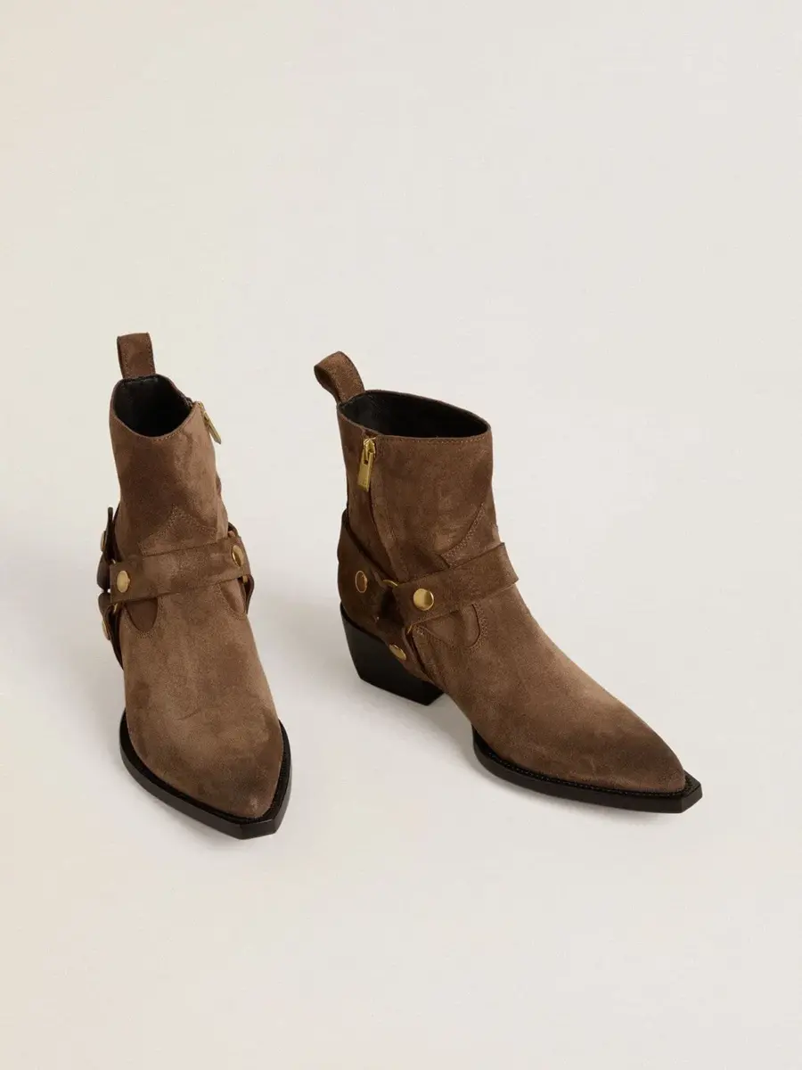 Alma rockera y estilo atemporal: la puntera puntiaguda, el ajuste ceñido y el diseño minimalista de las botas Debbie las hacen perfectas para cualquier ocasión. En esta versión baja, estas botas cuentan con una parte superior de ante gris paloma, cierre de cremallera en el lateral y costuras tono sobre tono. La hebilla extraíble con anilla y tachuelas en metal dorado envejecido y la placa metálica dorada con la firma Golden Goose grabada en el talón completan el look.