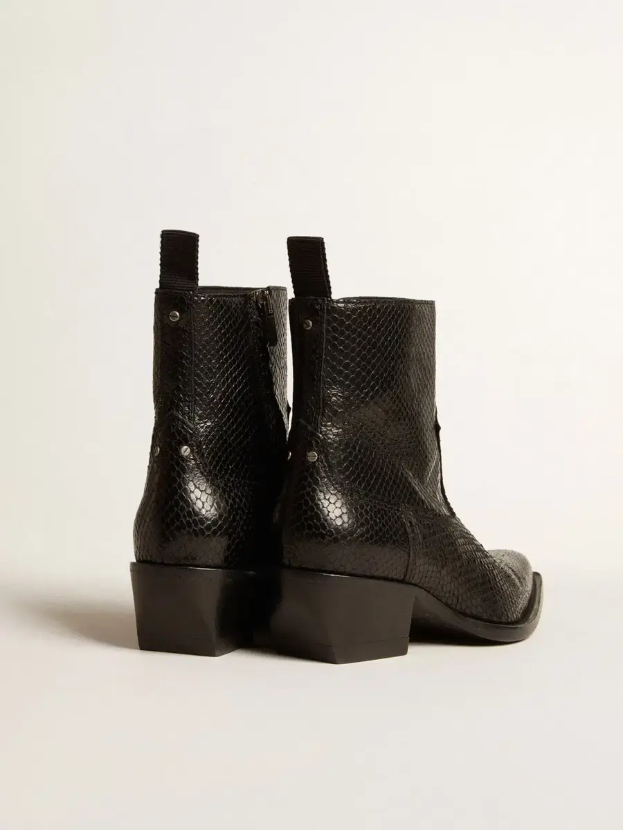 Alma rockera y estilo atemporal: la puntera puntiaguda, el ajuste ceñido y el diseño minimalista de los botines Debbie los hacen perfectos para cualquier ocasión. En esta versión baja, estos botines presentan una parte superior de piel negra con estampado de serpiente, costuras tono sobre tono y cierre de cremallera en el lateral. Los detalles de tachuelas metálicas y la placa metálica dorada con la firma Golden Goose grabada en el talón completan el look.