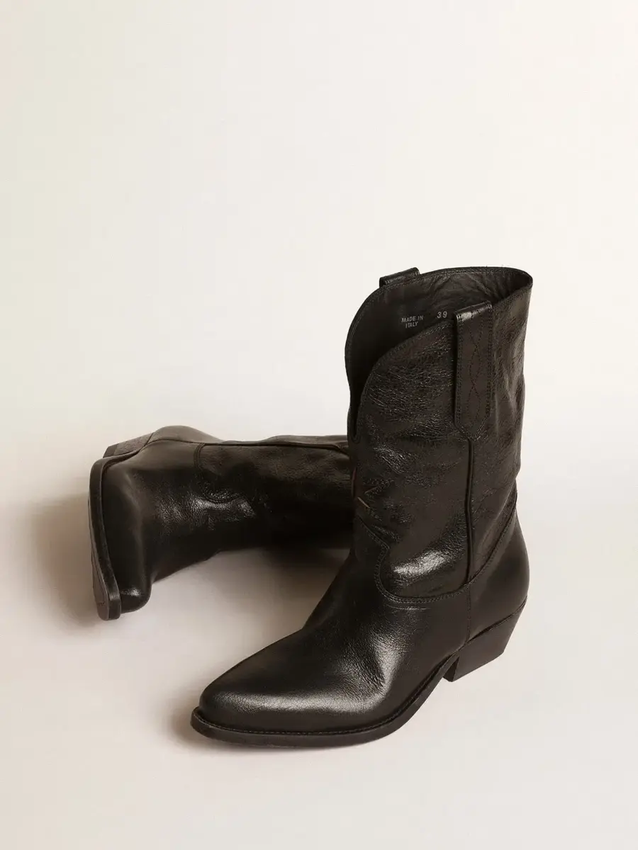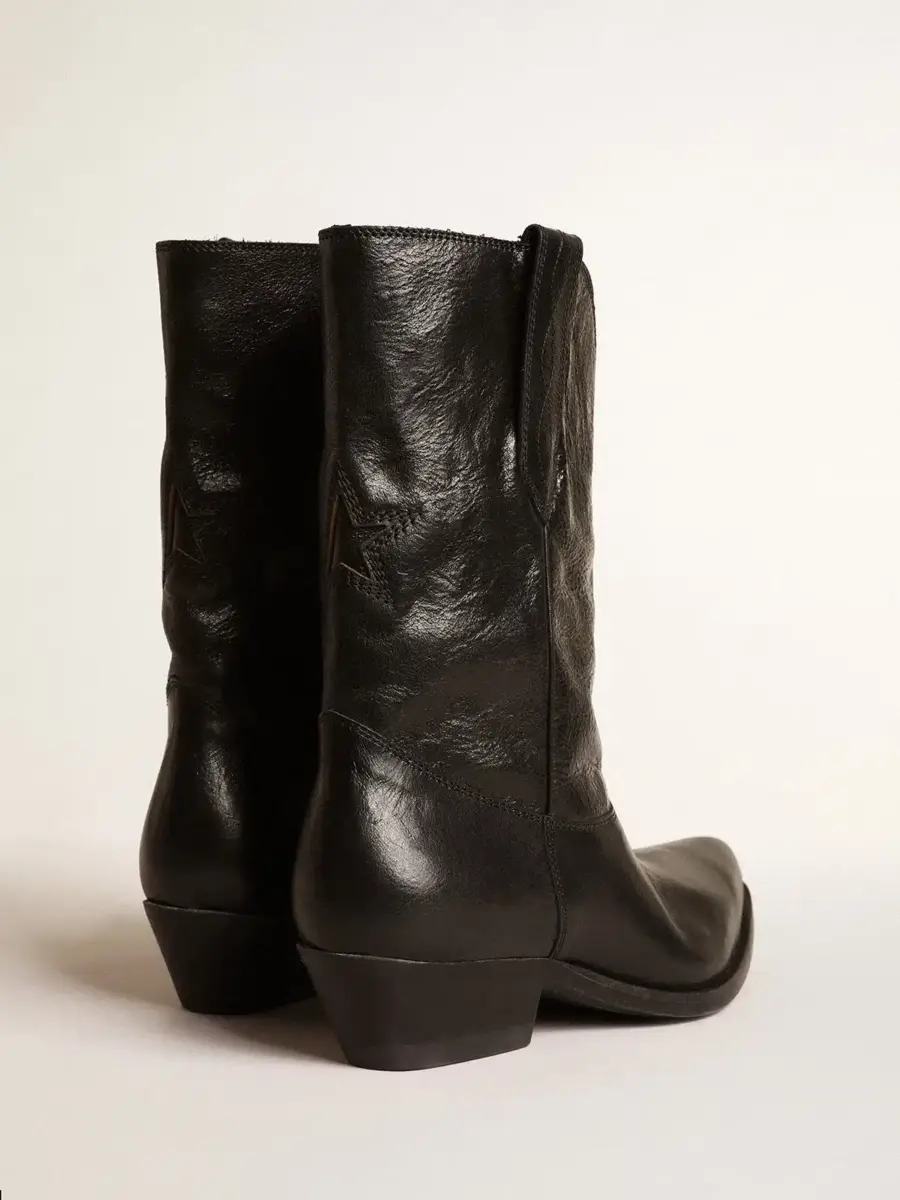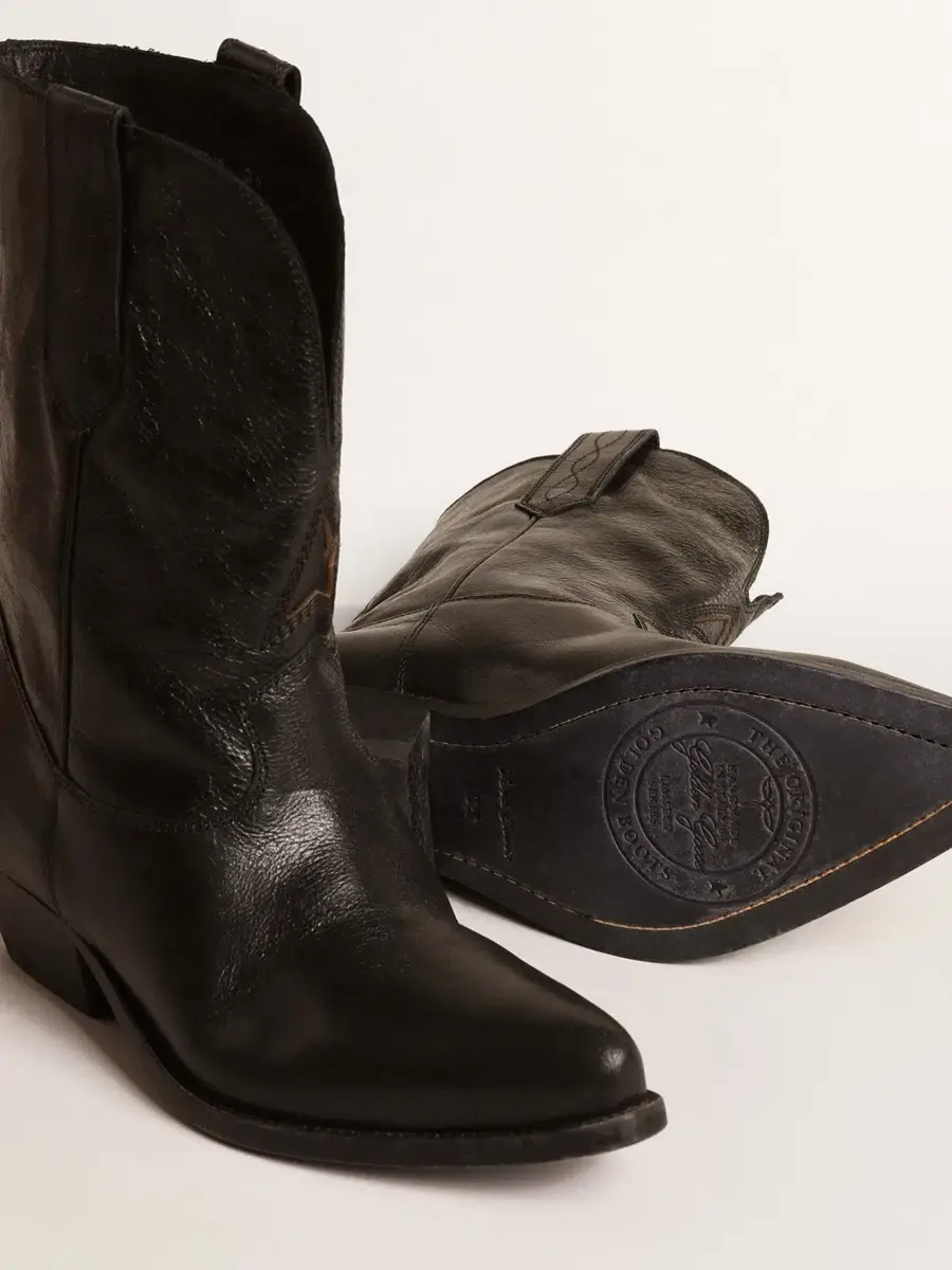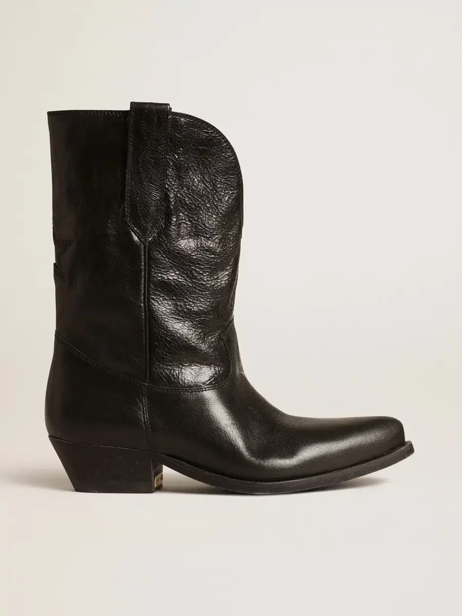 De Texas a Venecia: nuestras botas Wish Star cuentan nuestra trayectoria y nuestras pasiones, creando una combinación única entre la tradición artesanal veneciana y el espíritu cowboy. En esta versión baja, estas botas presentan una parte superior de piel negra con una estrella incrustada de piel negra y bordados tono sobre tono en la pierna. El detalle de ribete negro y la placa metálica dorada con la firma Golden Goose grabada en el talón completan el look.