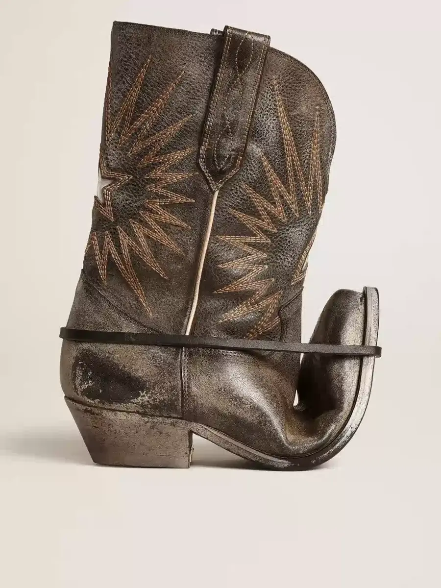 De Texas a Venecia: nuestras botas Wish Star cuentan nuestra trayectoria y nuestras pasiones, creando una combinación única entre la tradición artesanal veneciana y el espíritu cowboy. En esta versión baja para mujer, estas botas presentan una parte superior de cuero negro con efecto desgastado con una estrella incrustada de cuero laminado plateado, así como bordados con costuras crudo en contraste en la pierna y la puntera. El estilo se completa con ribetes de color ocre y una placa metálica dorada con la firma Golden Goose grabada en el talón.