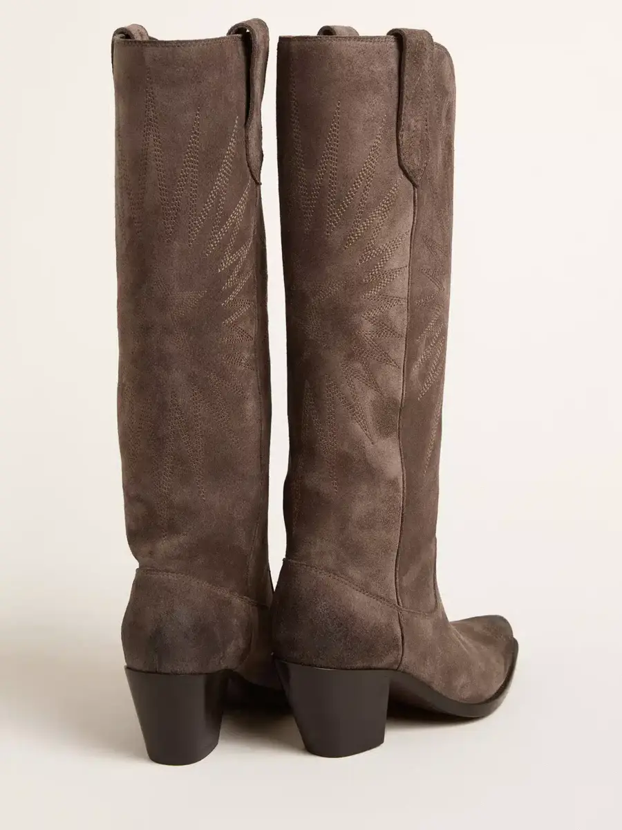 De Texas a Venecia: nuestras botas Wish Star cuentan nuestra trayectoria y nuestras pasiones, creando una combinación única entre la tradición artesanal veneciana y el espíritu cowboy. En esta versión alta, estas botas presentan una parte superior de ante marrón oscuro con estrella incrustada tono sobre tono. El detalle de ribete tono sobre tono y la placa metálica dorada con la firma Golden Goose grabada en el talón completan el look.