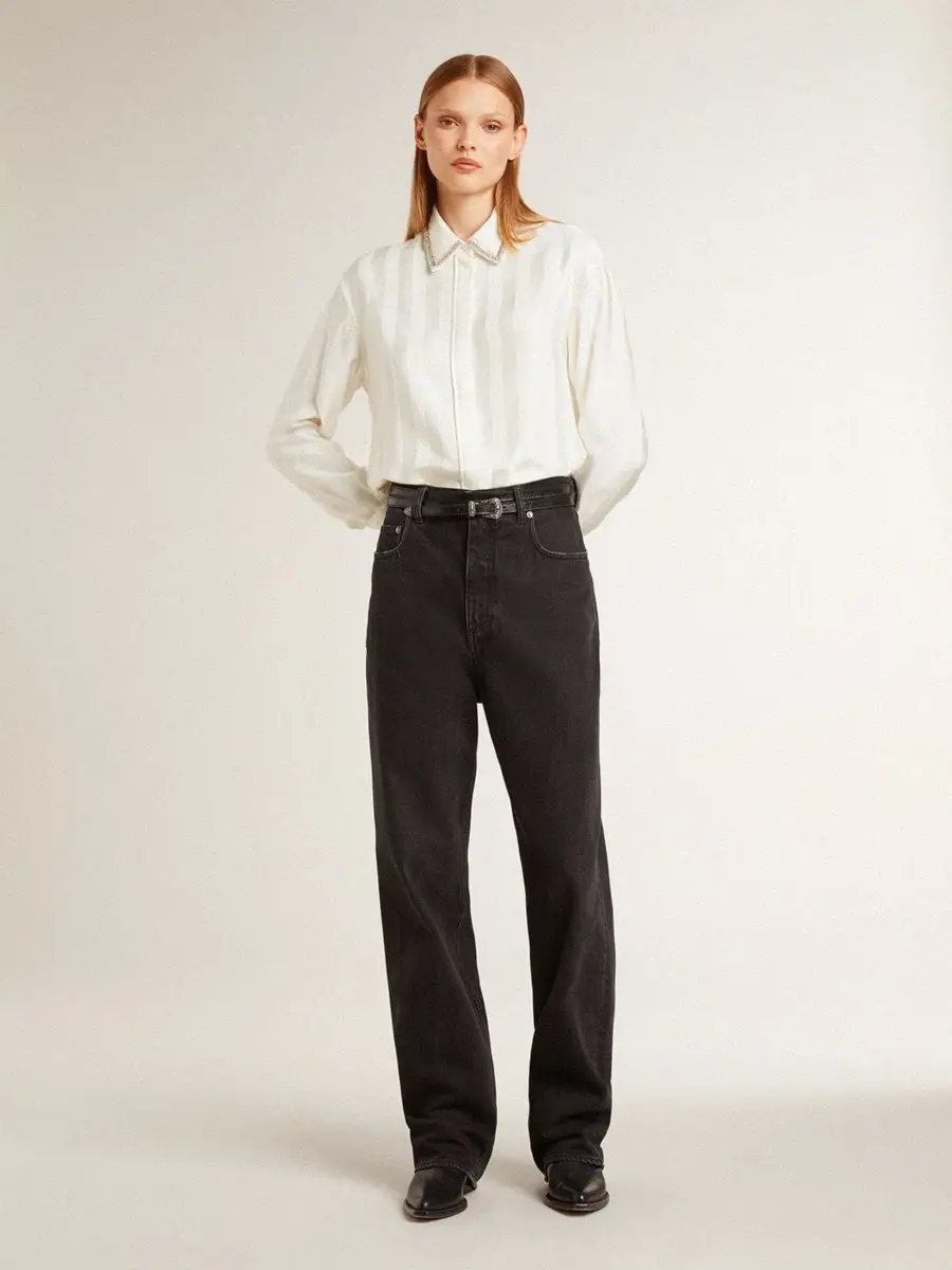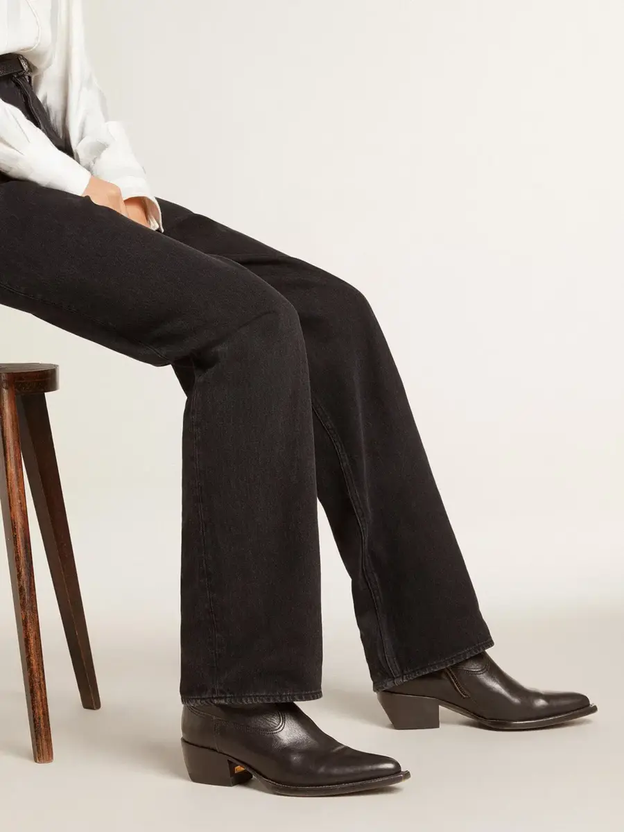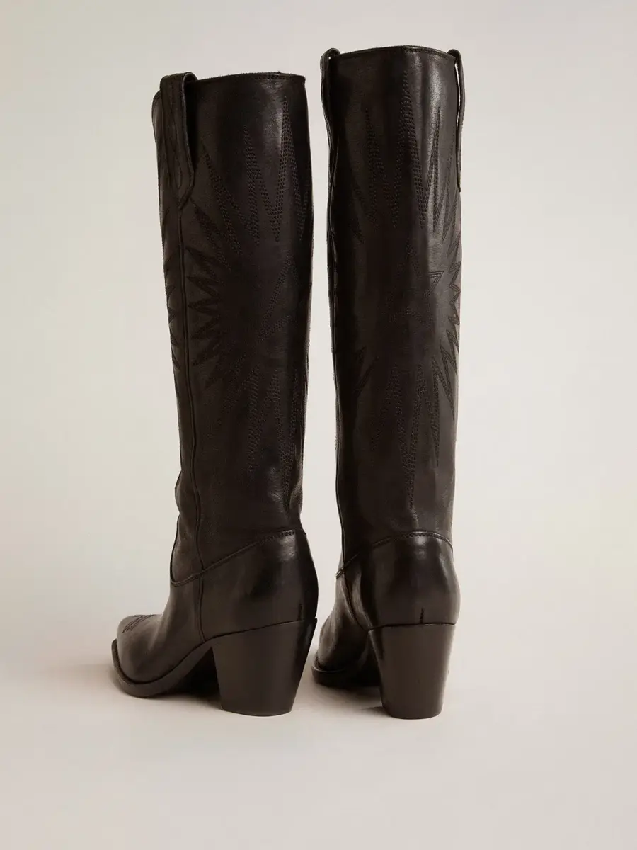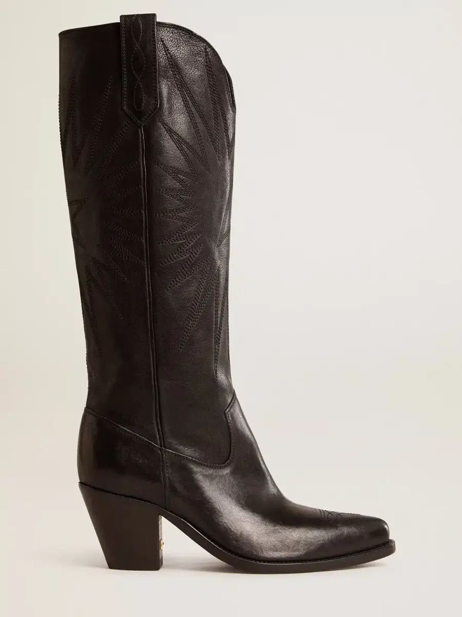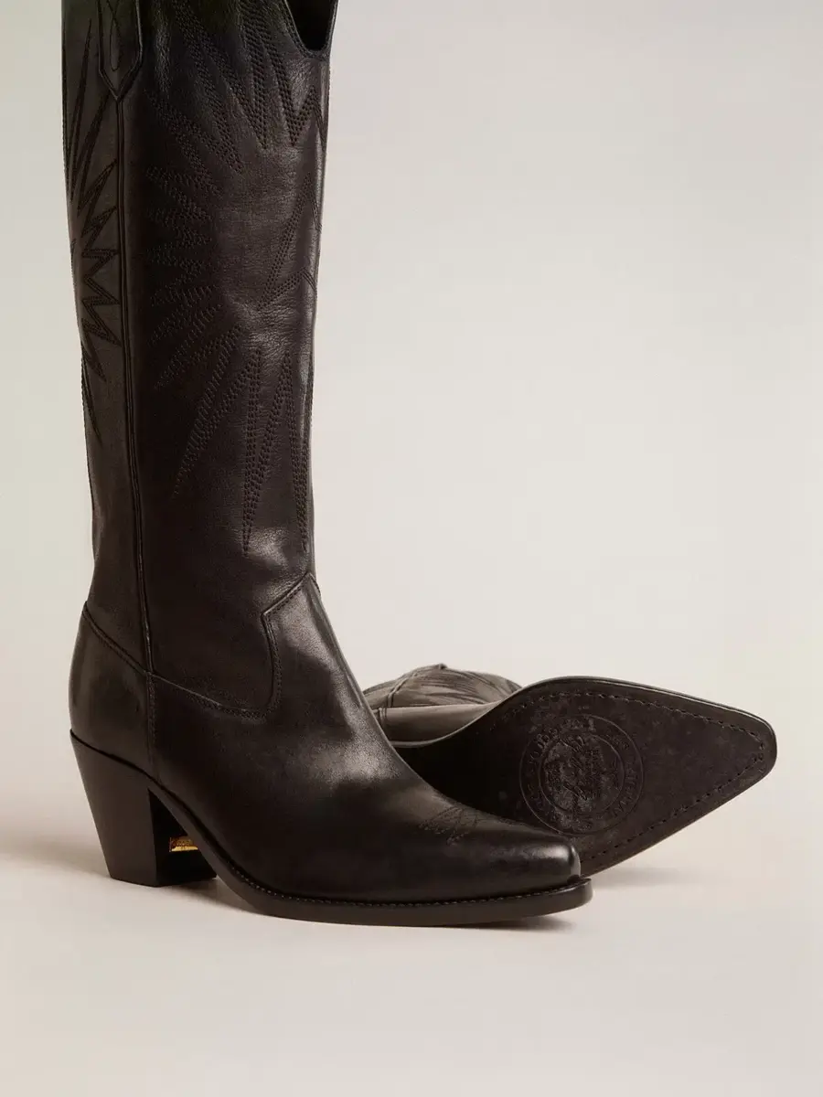 De Texas a Venecia: nuestras botas Wish Star cuentan nuestra trayectoria y nuestras pasiones, creando una combinación única entre la tradición artesanal veneciana y el espíritu cowboy. En versión alta con tacón alto, estas botas de mujer presentan una parte superior de piel negra con estrella bordada tono sobre tono y bordados con costuras de color negro en la pierna y la puntera. El ribete negro y la placa metálica dorada con la firma Golden Goose grabada en el talón completan el look.