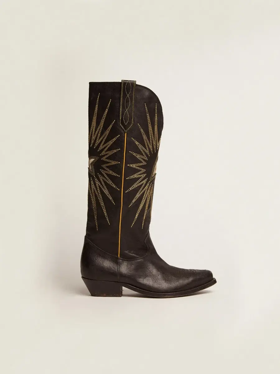 De Texas a Venecia: nuestras botas Wish Star cuentan nuestra trayectoria y nuestras pasiones, creando una combinación única entre la tradición artesanal veneciana y el espíritu cowboy. En versión alta con tacón bajo, estas botas de mujer presentan una parte superior de piel negra con una estrella incrustada de piel metalizada en color platino, así como bordados con costuras en contraste en color mostaza en la pierna y costuras tono sobre tono en la puntera. Completan el estilo un ribete en color ocre y una placa metálica dorada con la firma Golden Goose grabada en el talón.