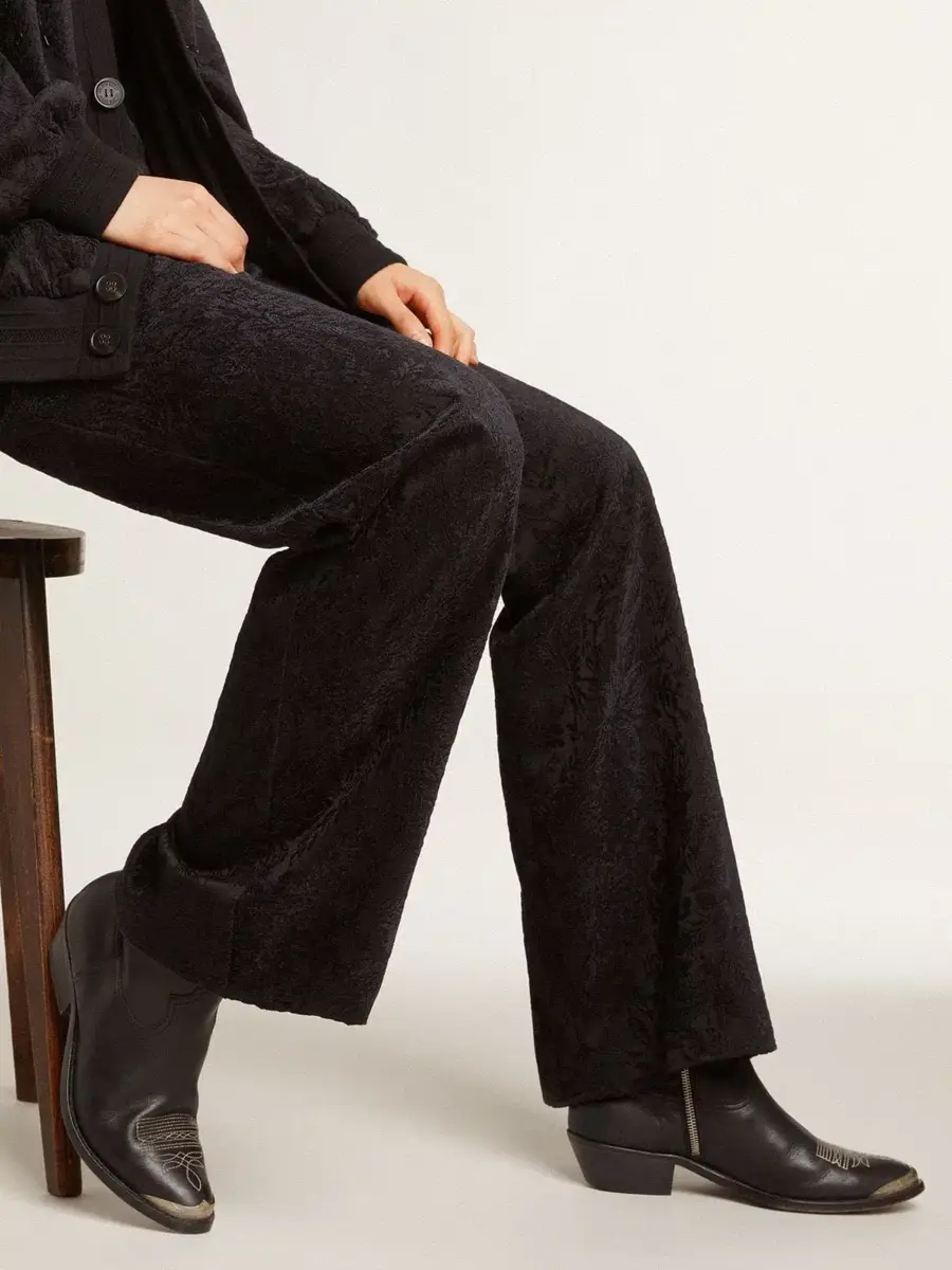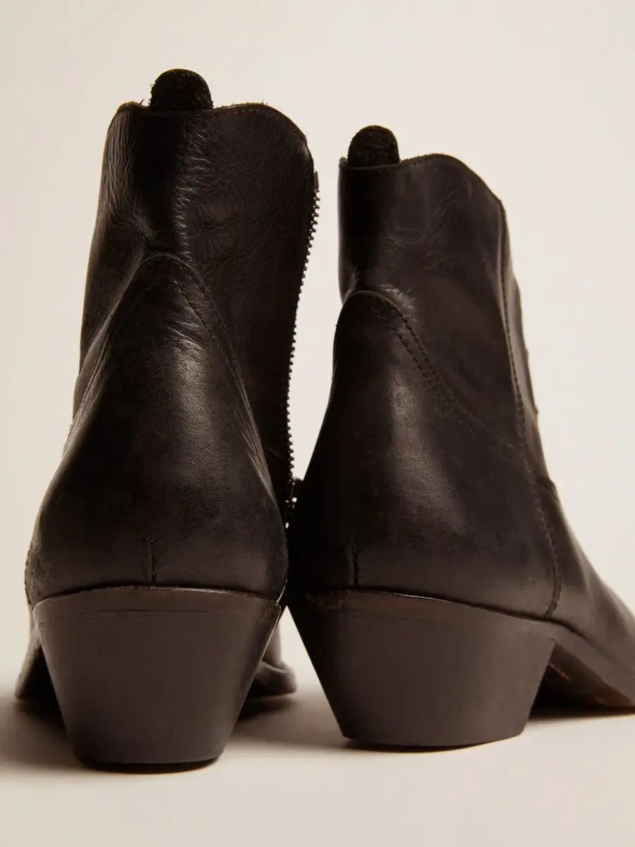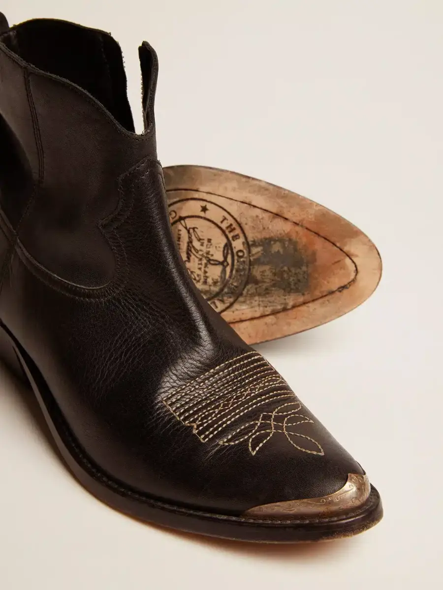 Las botas Young son una reinterpretación contemporánea de las clásicas botas vaqueras, feminizadas por sus líneas suaves y su tacón alto. Fabricadas a mano en piel y decoradas con costuras de color arena al estilo vaquero, este modelo presenta una parte superior de piel negra y una puntera de metal plateado con efecto envejecido. La cremallera lateral y la placa metálica dorada con la firma Golden Goose grabada en el talón completan el look.