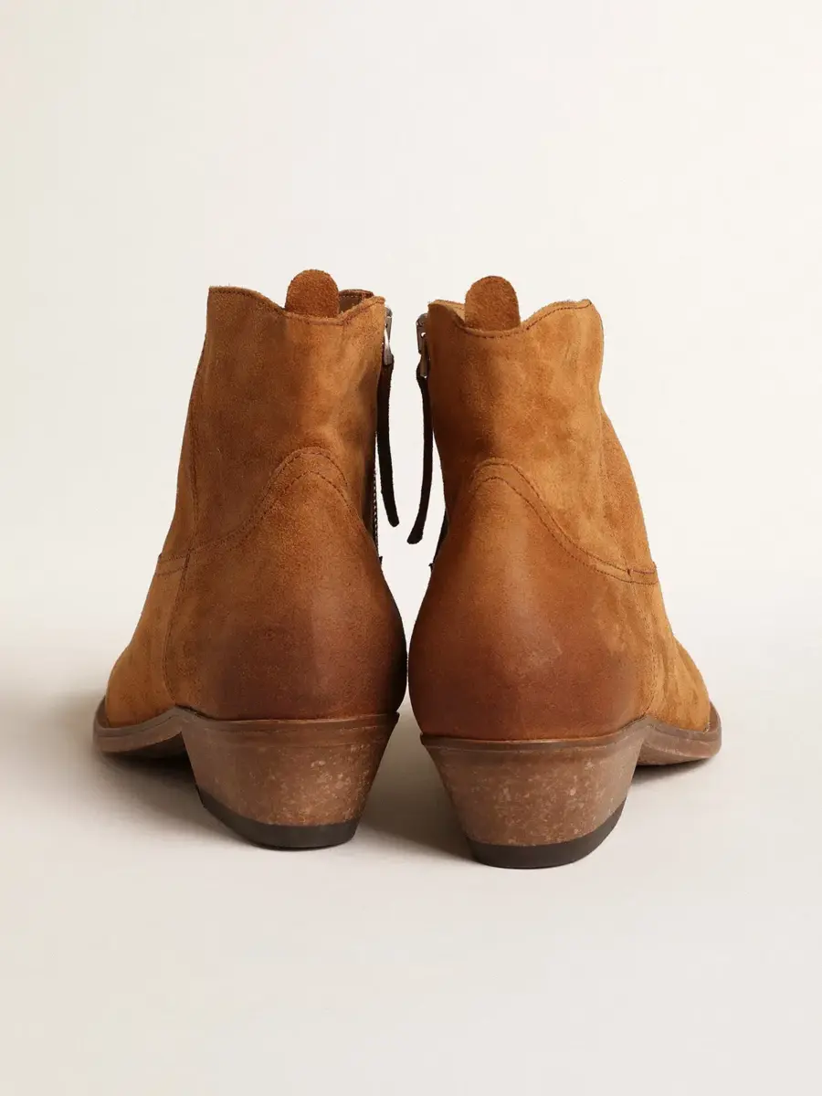 Los botines son una reinterpretación contemporánea de las clásicas botas vaqueras, feminizadas por sus líneas suavizadas y su tacón alto. Fabricados a mano en piel decorada con costuras de estilo vaquero, este modelo presenta una parte superior de ante color coñac y una puntera de metal plateado con efecto envejecido. La cremallera lateral y la placa metálica dorada con la firma Golden Goose grabada en el talón completan el look.