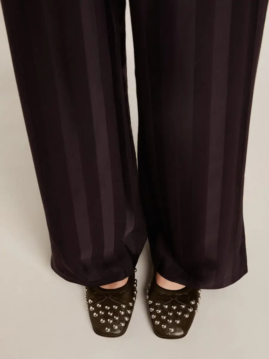 La sencillez que marca la diferencia. Nuestras bailarinas celebran el equilibrio entre practicidad y estilo, ofreciéndote un calzado versátil y femenino para cada momento del día. Esta versión presenta una parte superior de piel napa negra iluminada con tachuelas galvanizadas de color plateado. El lazo de piel negra en la puntera y la cremallera metálica galvanizada plateada en el talón completan el look.