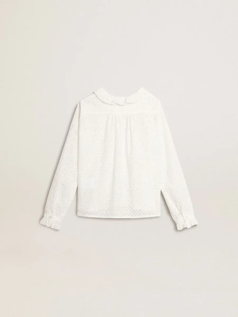 Hemos dedicado años a crear, dar forma y remodelar, sin conformarnos nunca con menos. Esta camisa de corte regular para niña, confeccionada en algodón blanco con bordado inglés, presenta puños y cuello con volantes y un logotipo bordado en blanco en el pecho. El cierre con botones le da el toque final.