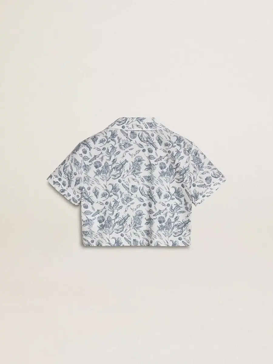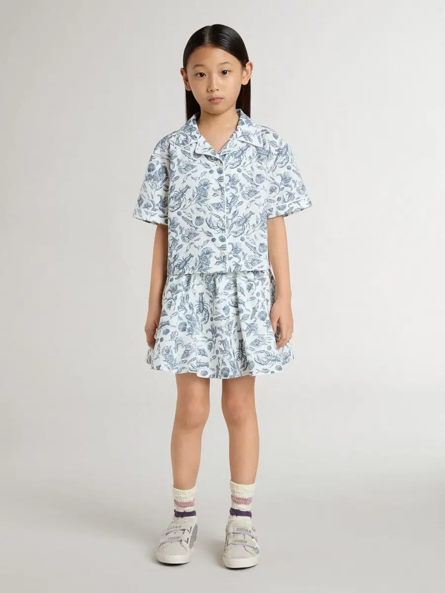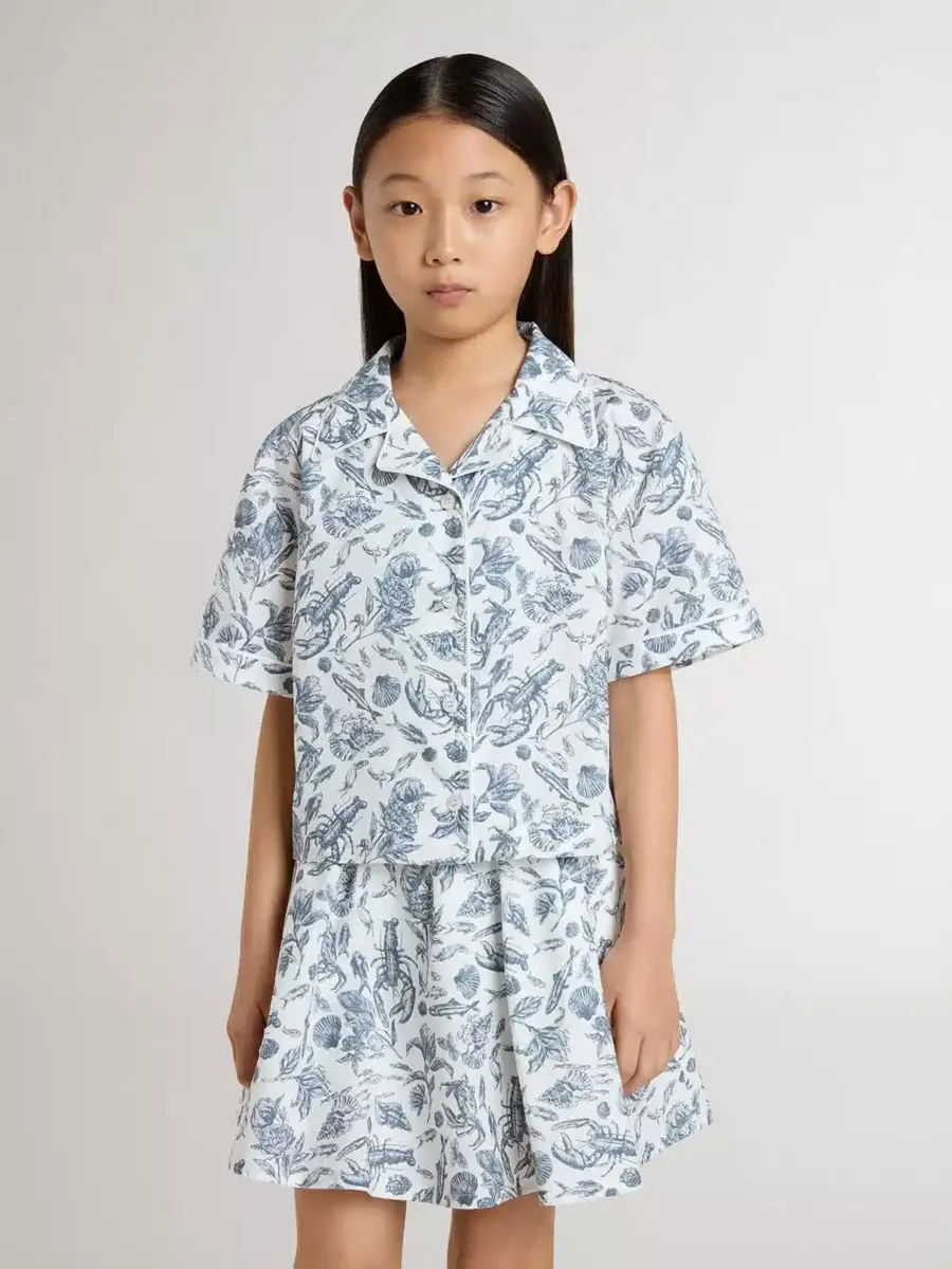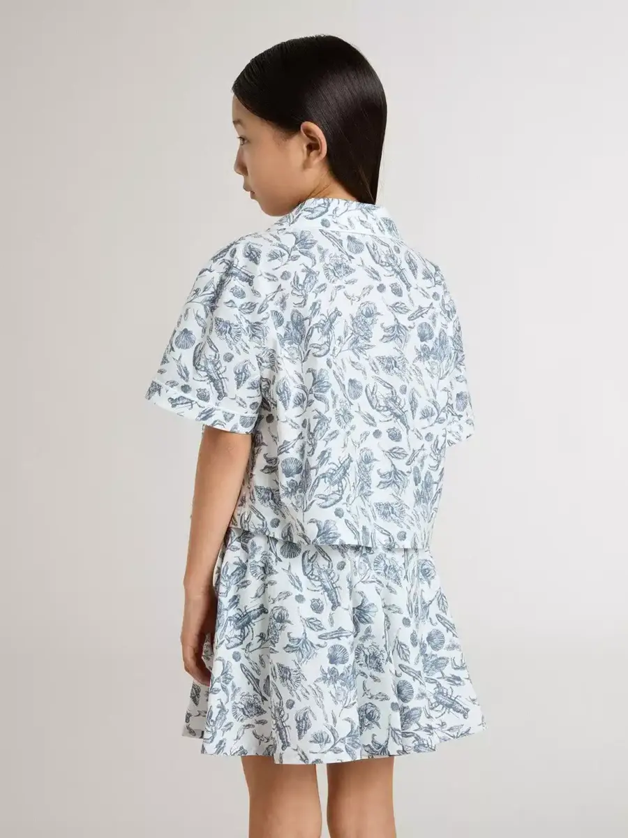 Hemos dedicado años a crear, dar forma y remodelar, sin conformarnos nunca con menos. Esta camisa corta blanca para niña presenta un estampado azul náutico y mangas cortas. Los ribetes blancos y el cierre con botones le dan el toque final.