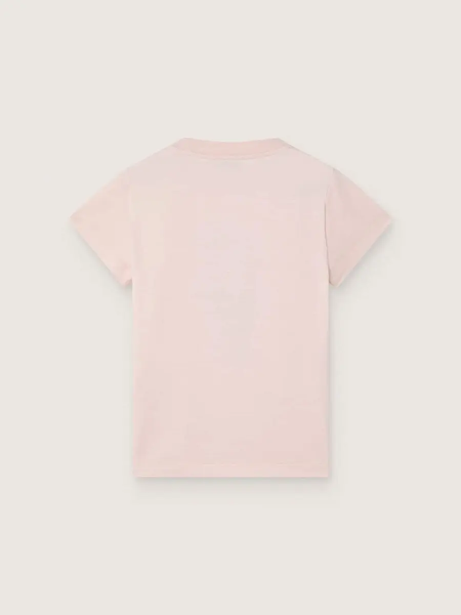 Una colección creada para estar a tu lado en todo momento, lista para acompañarte en días soleados y aventuras inolvidables. Esta camiseta para niña en jersey de algodón rosa presenta un estampado digital con la mascota Golden en tonos rosas. El cuello redondo y las mangas cortas completan el look.