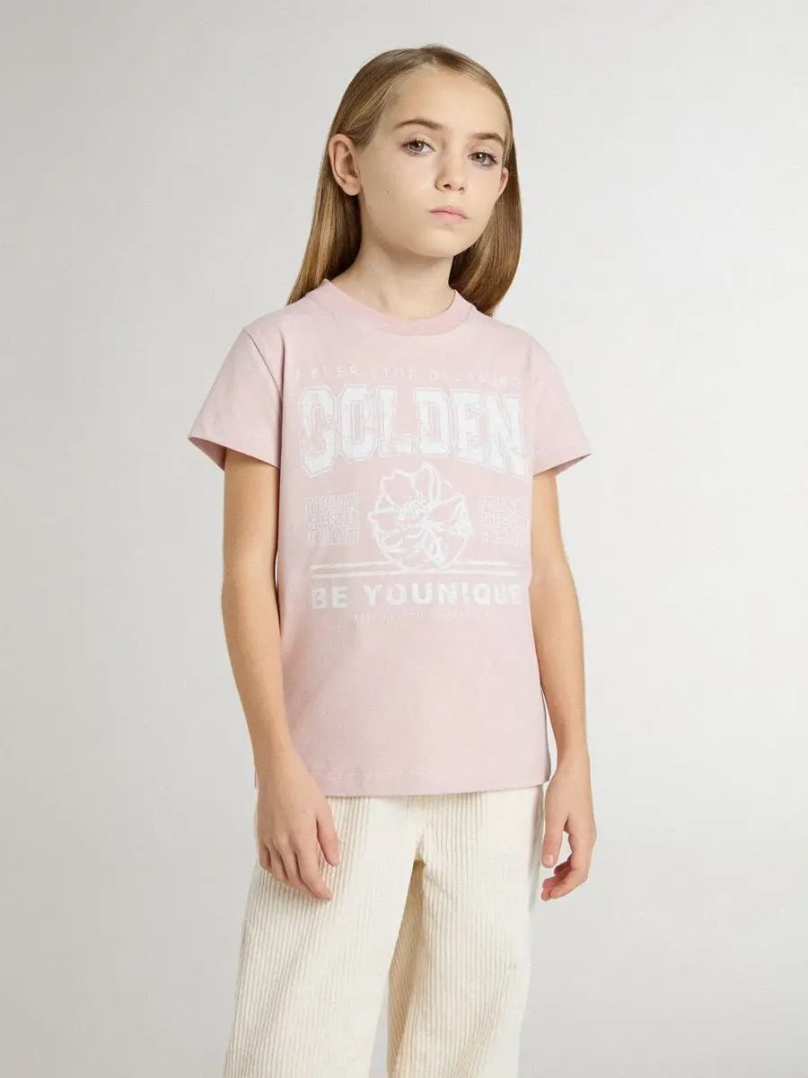 Hemos dedicado años a crear, dar forma y remodelar, sin conformarnos nunca con menos. Esta camiseta rosa para niñas tiene un estampado blanco en la parte delantera.