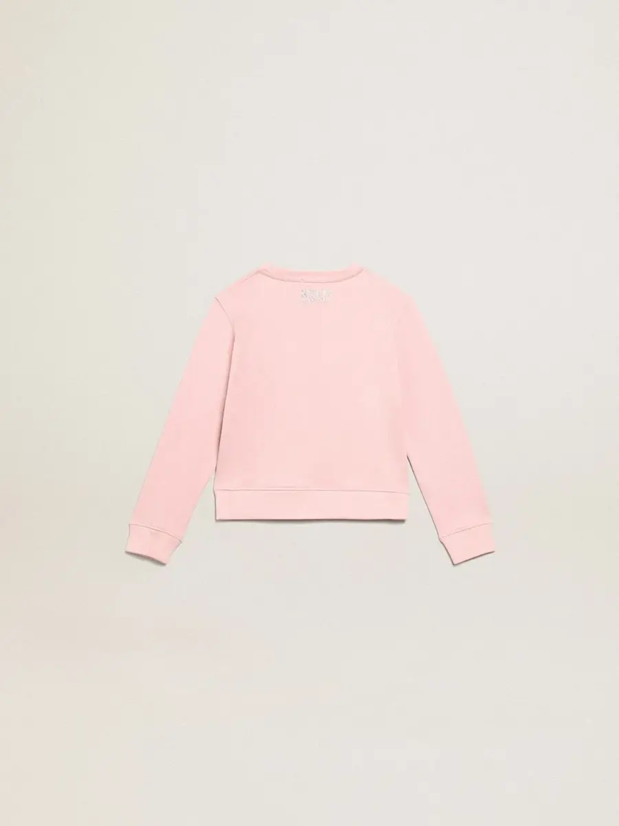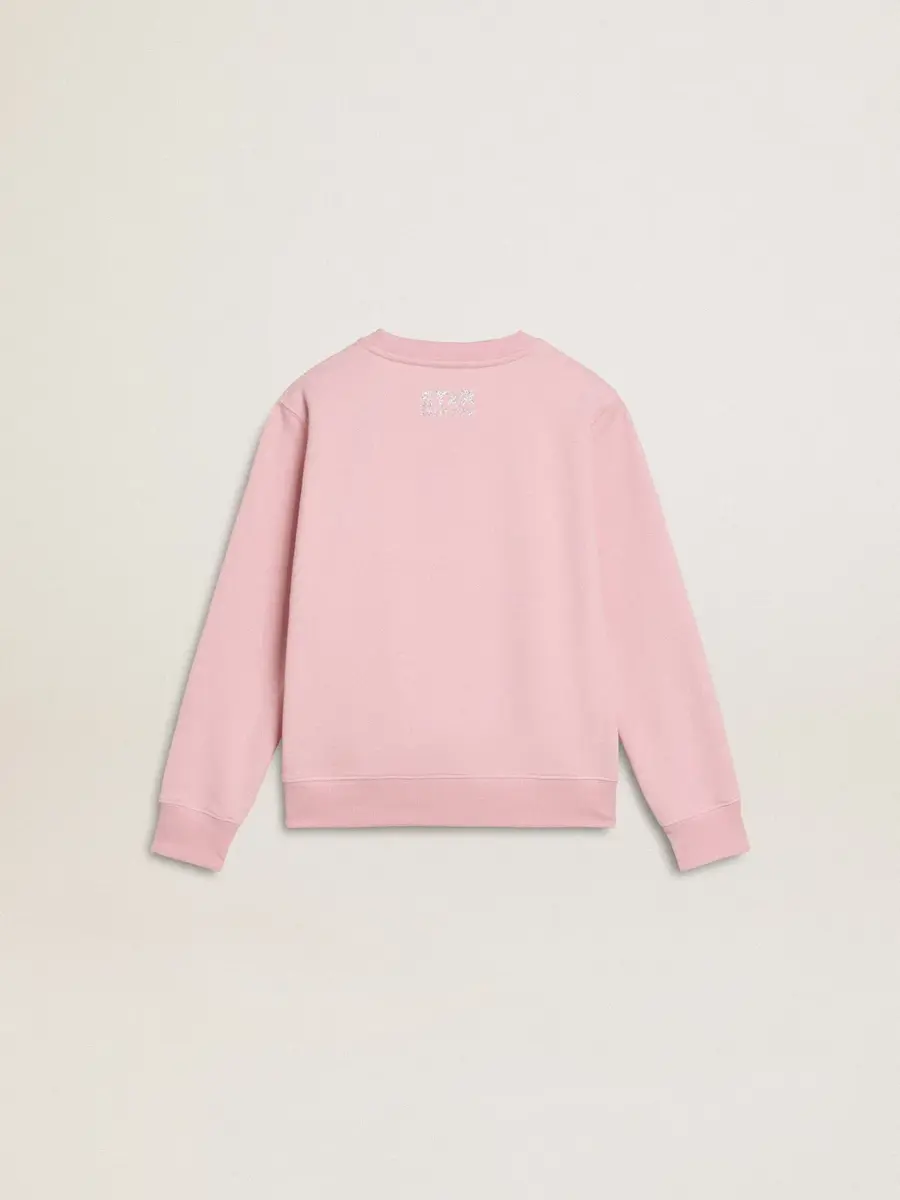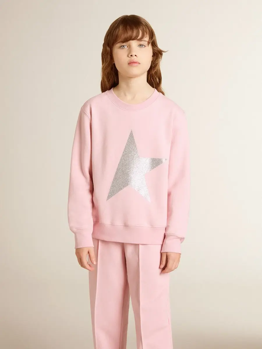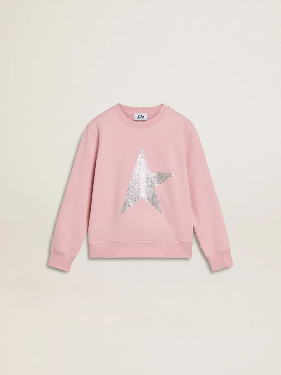 Una colección con un espíritu informal pero versátil: inspirada en los años setenta, tiene un atractivo vintage atemporal, adecuado para cualquier ocasión o look. Esta sudadera de algodón puro, de corte regular y cuello redondo en color rosa, presenta una estrella maxi en la parte delantera y el logotipo en la parte trasera, ambos en purpurina plateada.