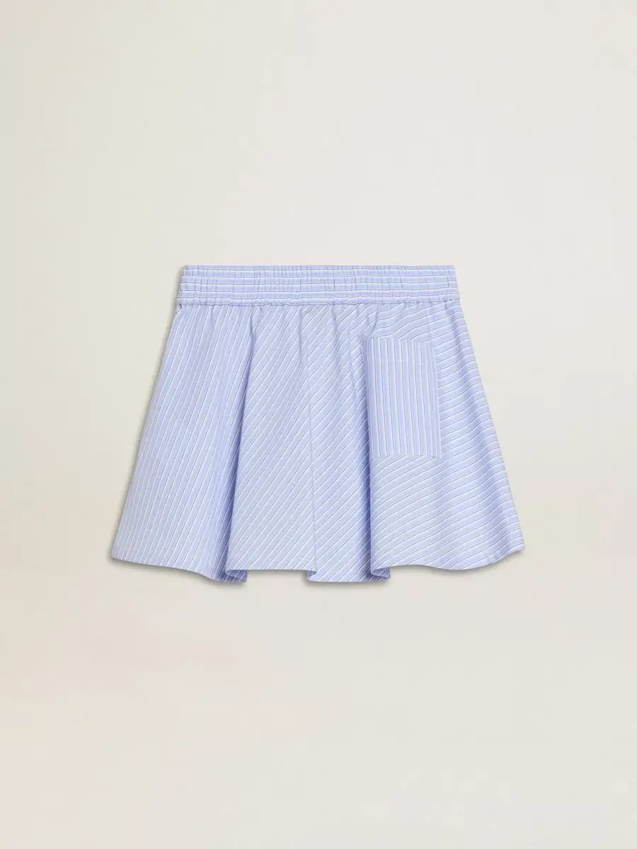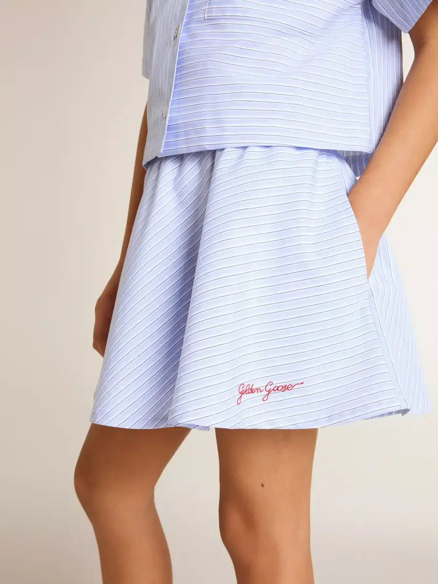 Una colección creada para acompañarte en todo momento, lista para acompañarte en días soleados y aventuras inolvidables. Confeccionada en algodón ligero con volantes, esta falda azul claro para niña presenta rayas por toda la prenda y cintura elástica. El logotipo bordado en rojo le da el toque final.
