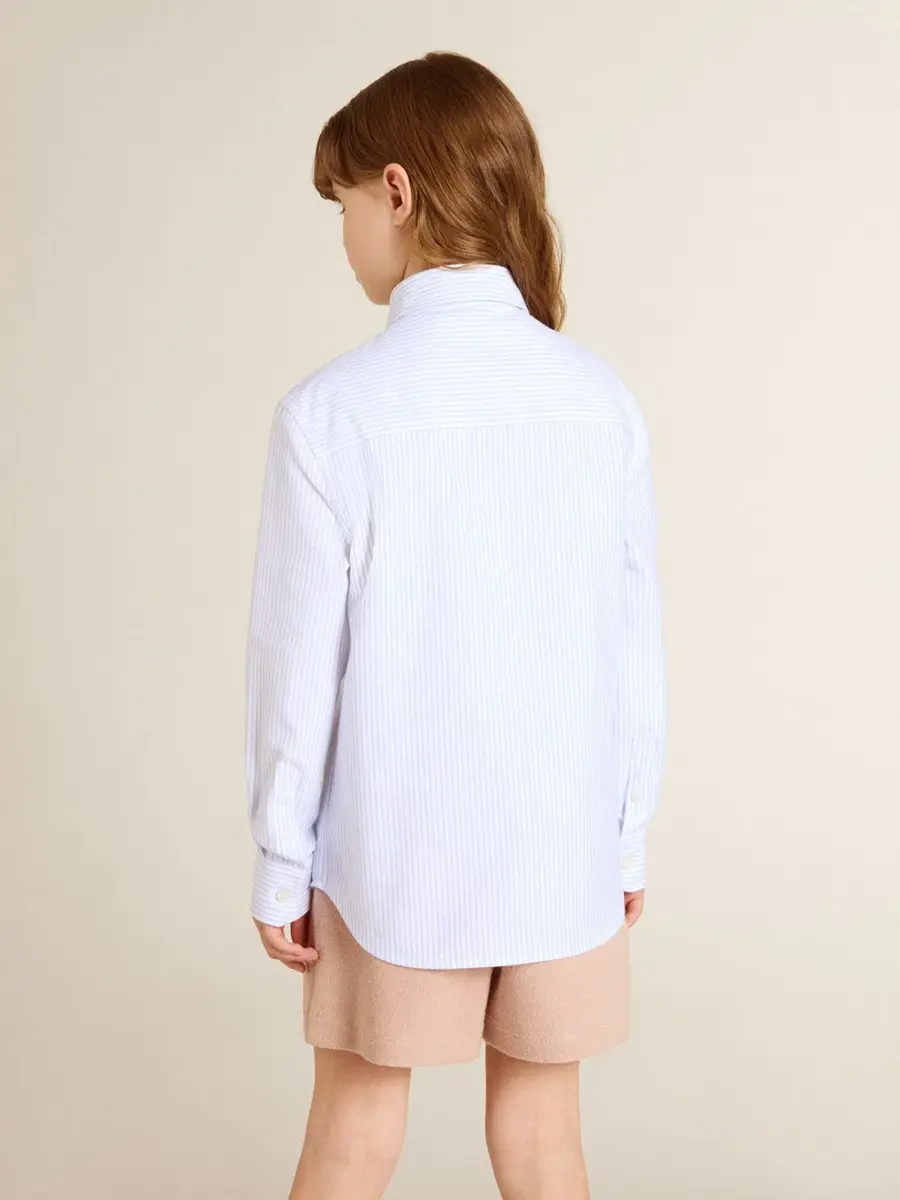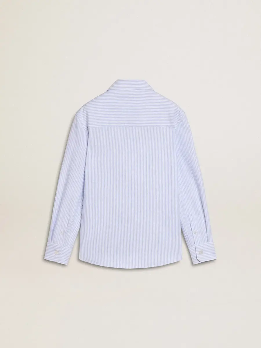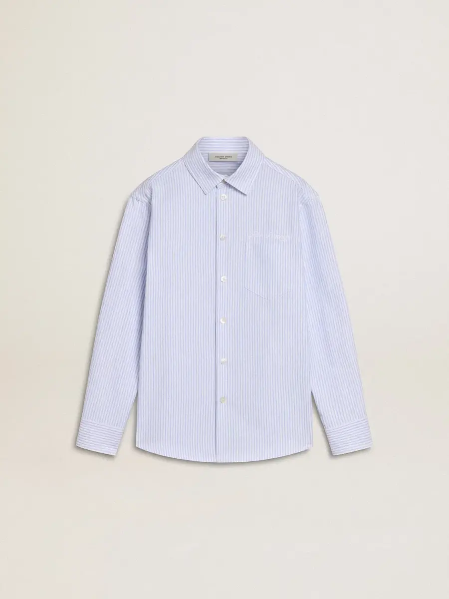 Una colección creada para estar a tu lado en todo momento, lista para acompañarte en días soleados y aventuras inolvidables. En azul claro con rayas blancas, esta camisa de corte regular presenta letras bordadas en el bolsillo del pecho.