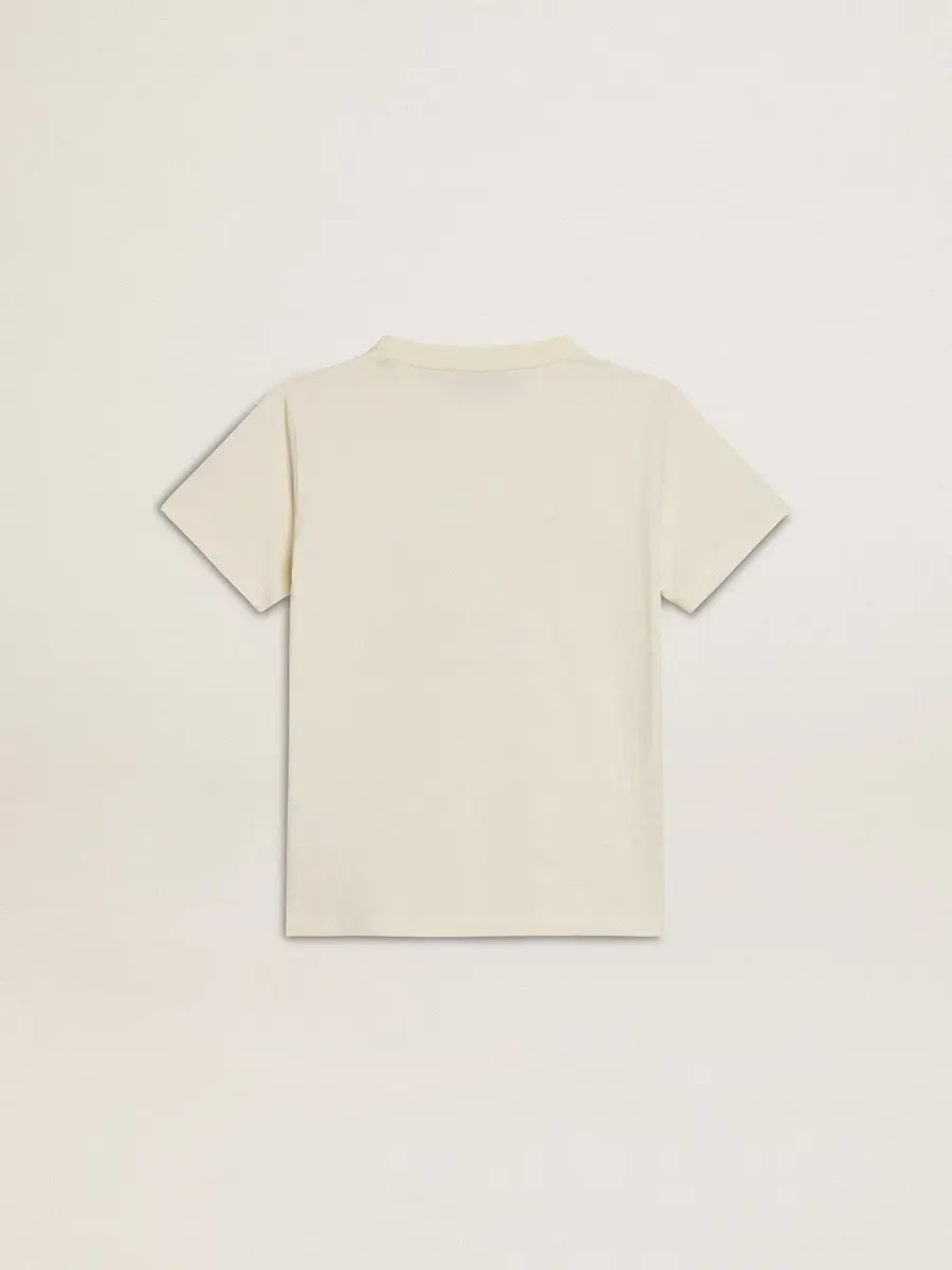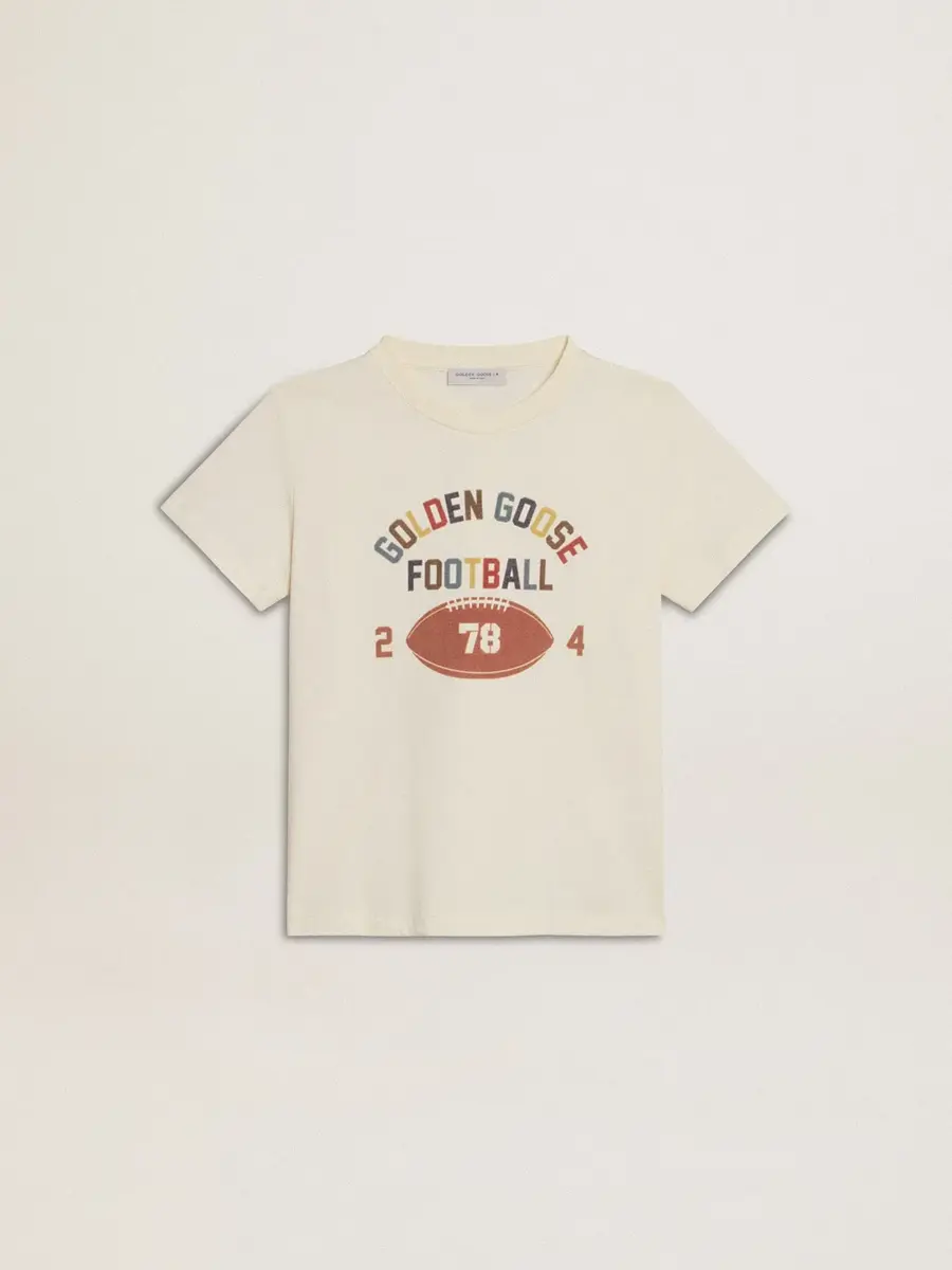 Una historia de amor a nuestra ciudad natal, Marghera. Donde todo comenzó. Nuestra última colección refleja el espíritu de nuestro lugar de origen, sus contrastes, su alma industrial y sus paisajes manufactureros, entrelazando inspiraciones tanto de la vibrante energía de la ropa de trabajo como de la refinada esencia de la sastrería tradicional. Esta camiseta de algodón blanco desgastado presenta letras multicolores de Golden Goose Football en el centro.