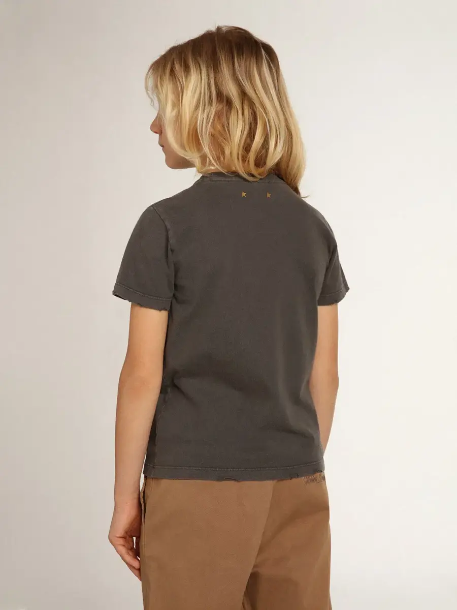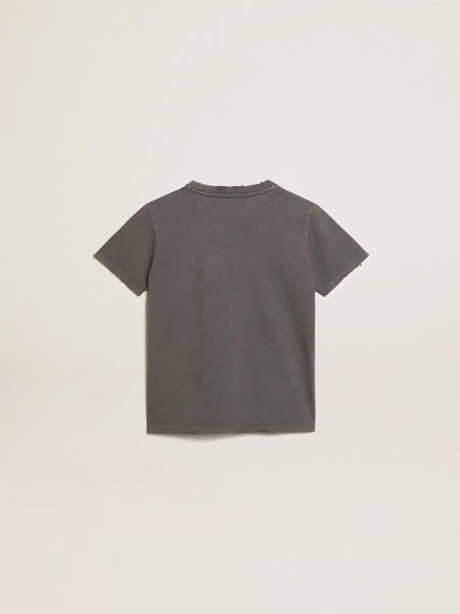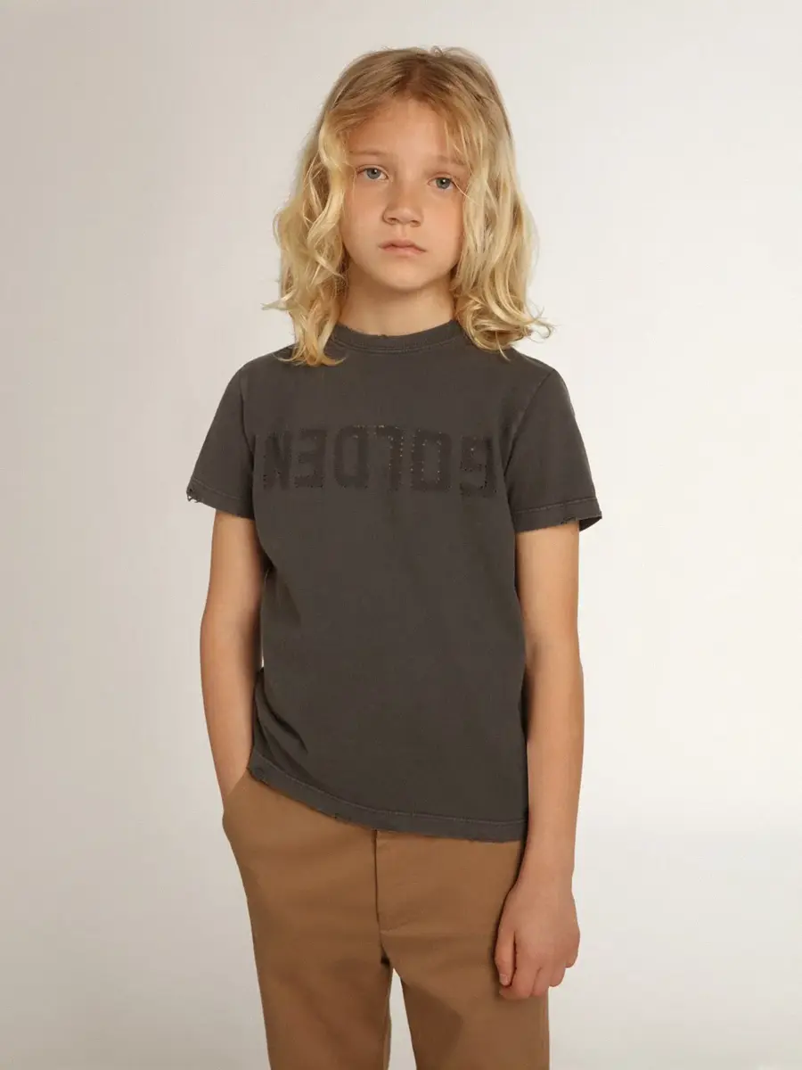 Una colección única y atemporal que encapsula el ADN de Golden Goose, diseñada para acompañarte cada día, en las buenas y en las malas, llueva o haga sol. Esta camiseta de corte regular para niño, en algodón gris antracita con efecto desgastado, presenta el logotipo Golden realizado con un tratamiento de resistencia.