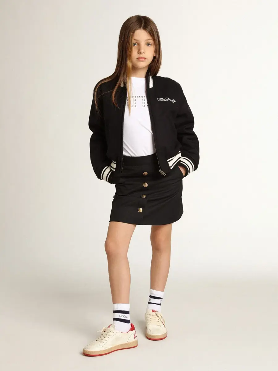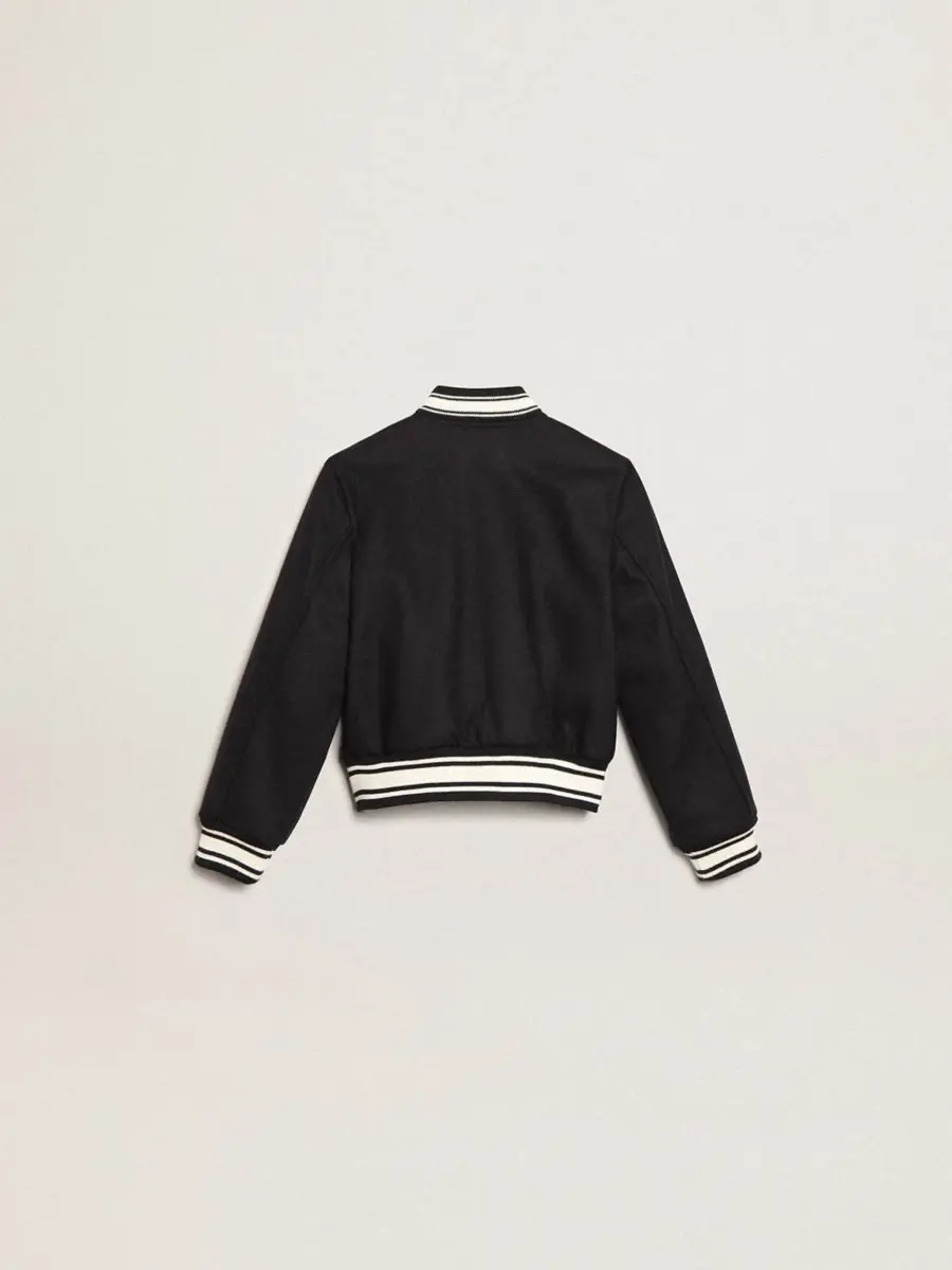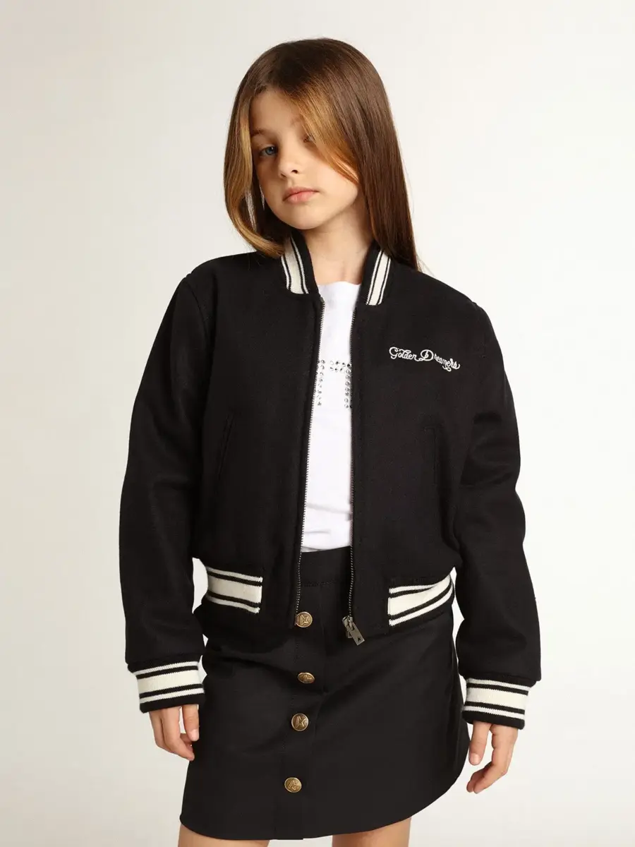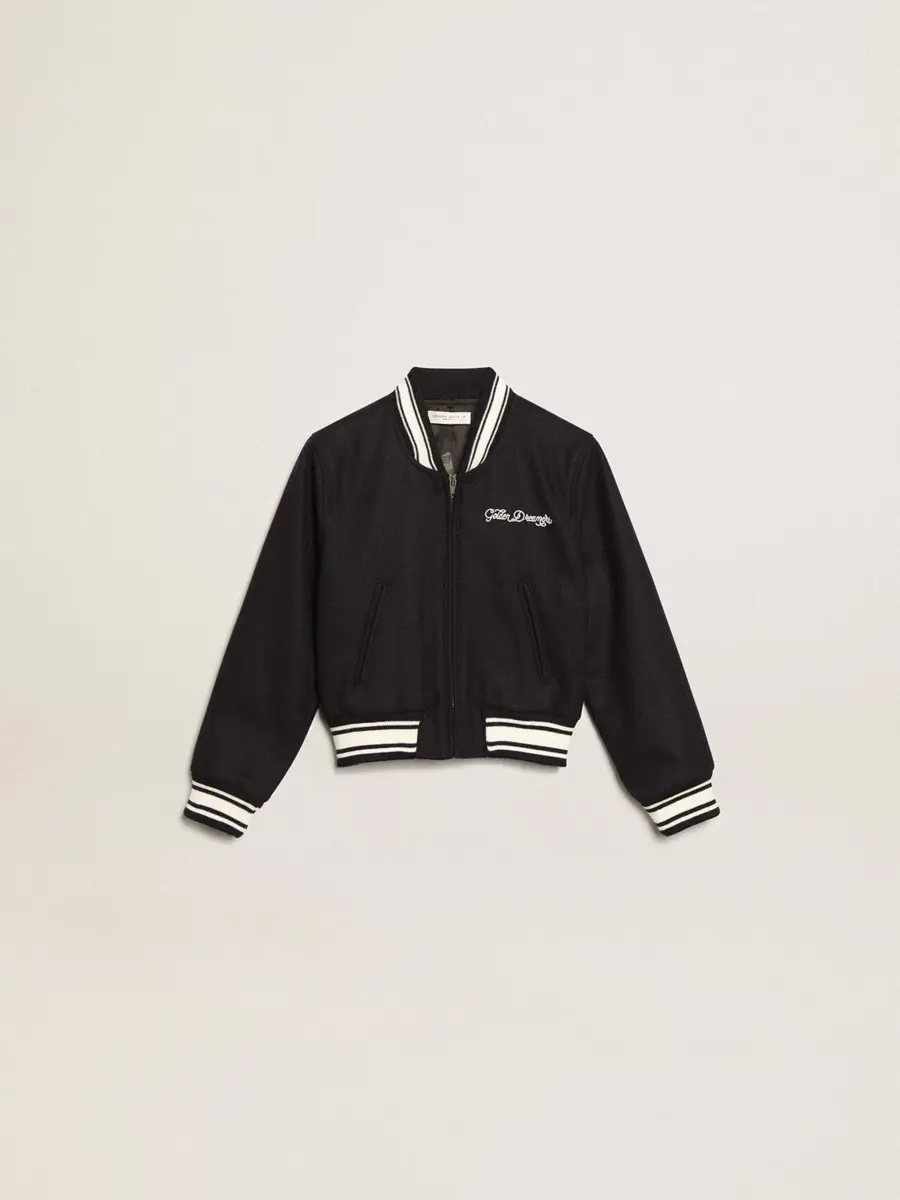 Una colección única y atemporal que encapsula el ADN de Golden Goose, diseñada para acompañarte cada día, en las buenas y en las malas, llueva o haga sol. Esta chaqueta bomber de corte clásico para niño, confeccionada en mezcla de lana azul oscuro, presenta ribetes blancos a contraste y las letras Golden en blanco en la parte delantera.