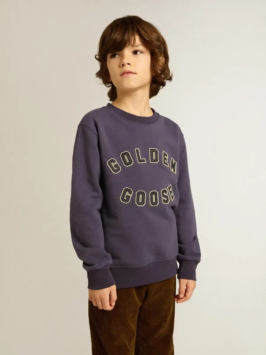 Una historia de amor a nuestra ciudad natal, Marghera. Donde todo comenzó. Nuestra última colección refleja el espíritu de nuestro lugar de origen, sus contrastes, su alma industrial y sus paisajes manufactureros, entrelazando inspiraciones tanto de la vibrante energía de la ropa de trabajo como de la refinada esencia de la sastrería tradicional. Esta sudadera de algodón de corte regular para niño en azul violeta presenta letras Golden Goose en parches en la parte delantera.