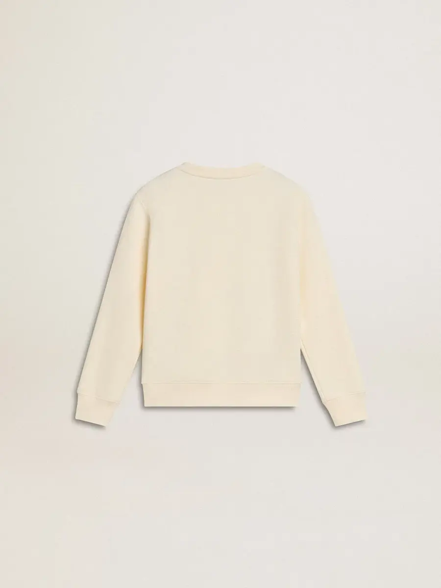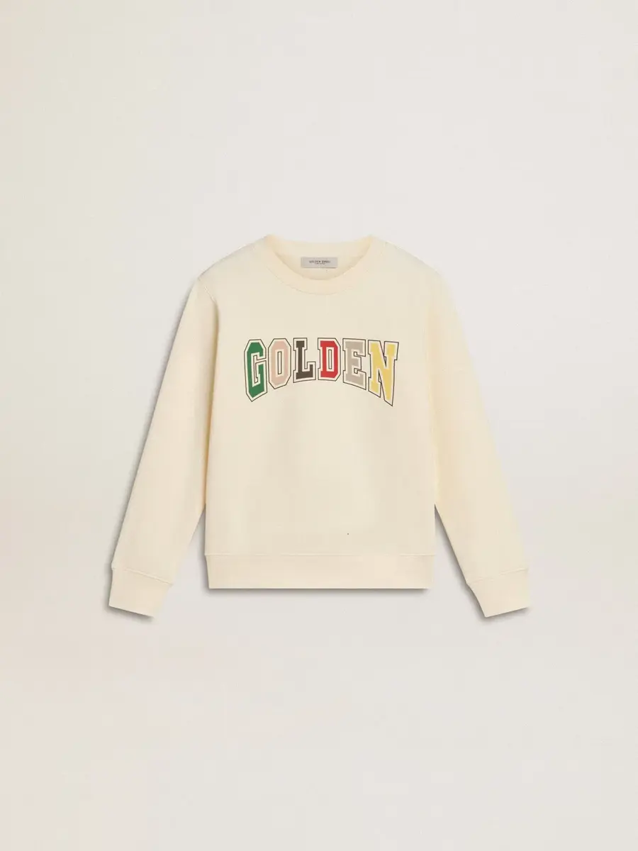 Sudadera en blanco desgastado con letras doradas multicolores en la parte delantera