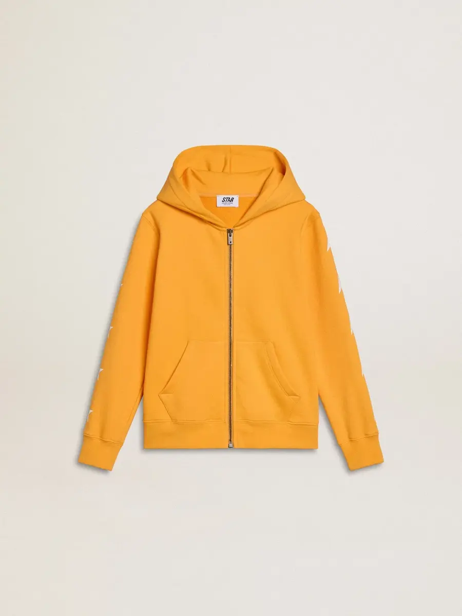 Una colección con un espíritu informal pero versátil: inspirada en los años setenta, tiene un atractivo vintage atemporal, adecuado para cualquier ocasión o look. Esta sudadera naranja de algodón con capucha, corte recto y cierre de cremallera presenta estrellas blancas en las mangas.