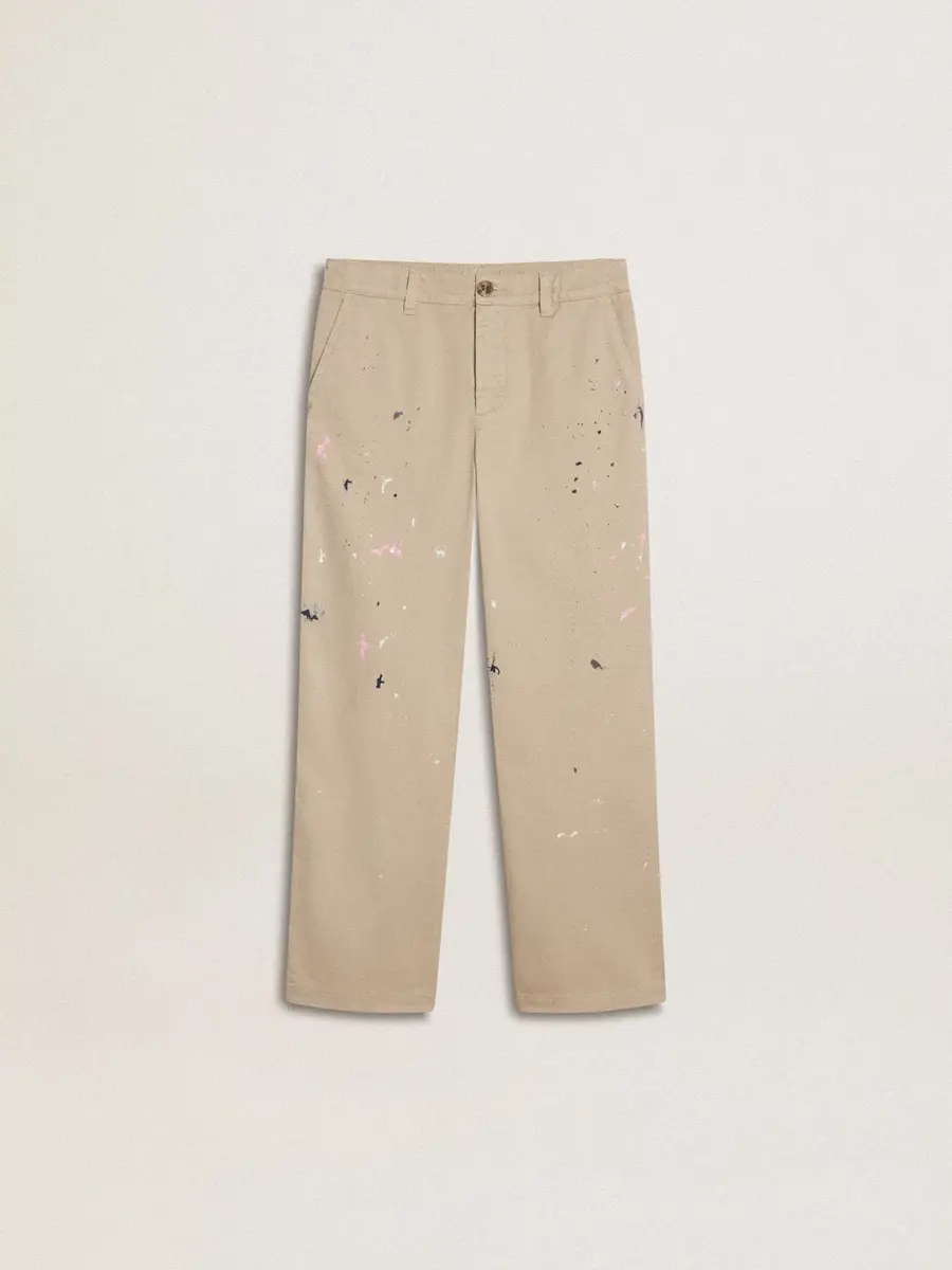 Una colección con un espíritu informal pero versátil: inspirada en los años setenta, tiene un atractivo vintage atemporal, adecuado para cualquier ocasión o look. Con un corte regular, estos pantalones chinos unisex de color beige presentan salpicaduras multicolores. El logotipo bordado en beige en la parte trasera y los cuatro bolsillos añaden el toque final.