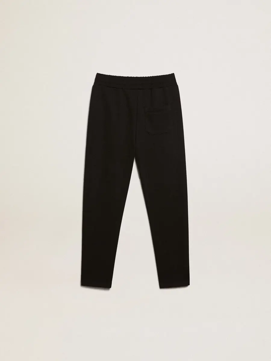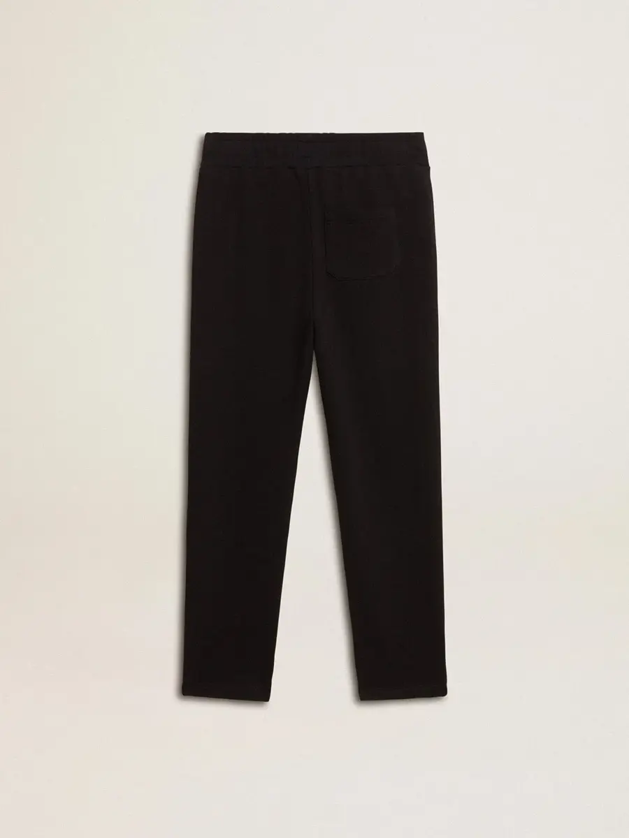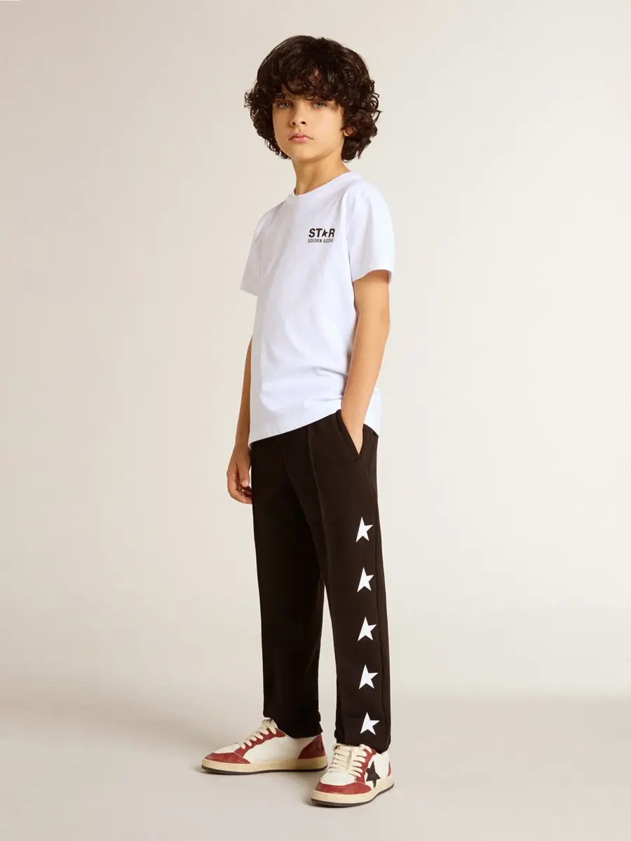 Una colección con un espíritu informal pero versátil: inspirada en los años setenta, tiene un atractivo vintage atemporal, adecuado para cualquier ocasión o look. Inspirados en el mundo de la sastrería, con pliegues cosidos en la parte delantera, estos pantalones de chándal para niño de algodón puro en color negro presentan un corte ajustado en las piernas. Las estrellas blancas en contraste en los laterales de las piernas añaden el toque final.