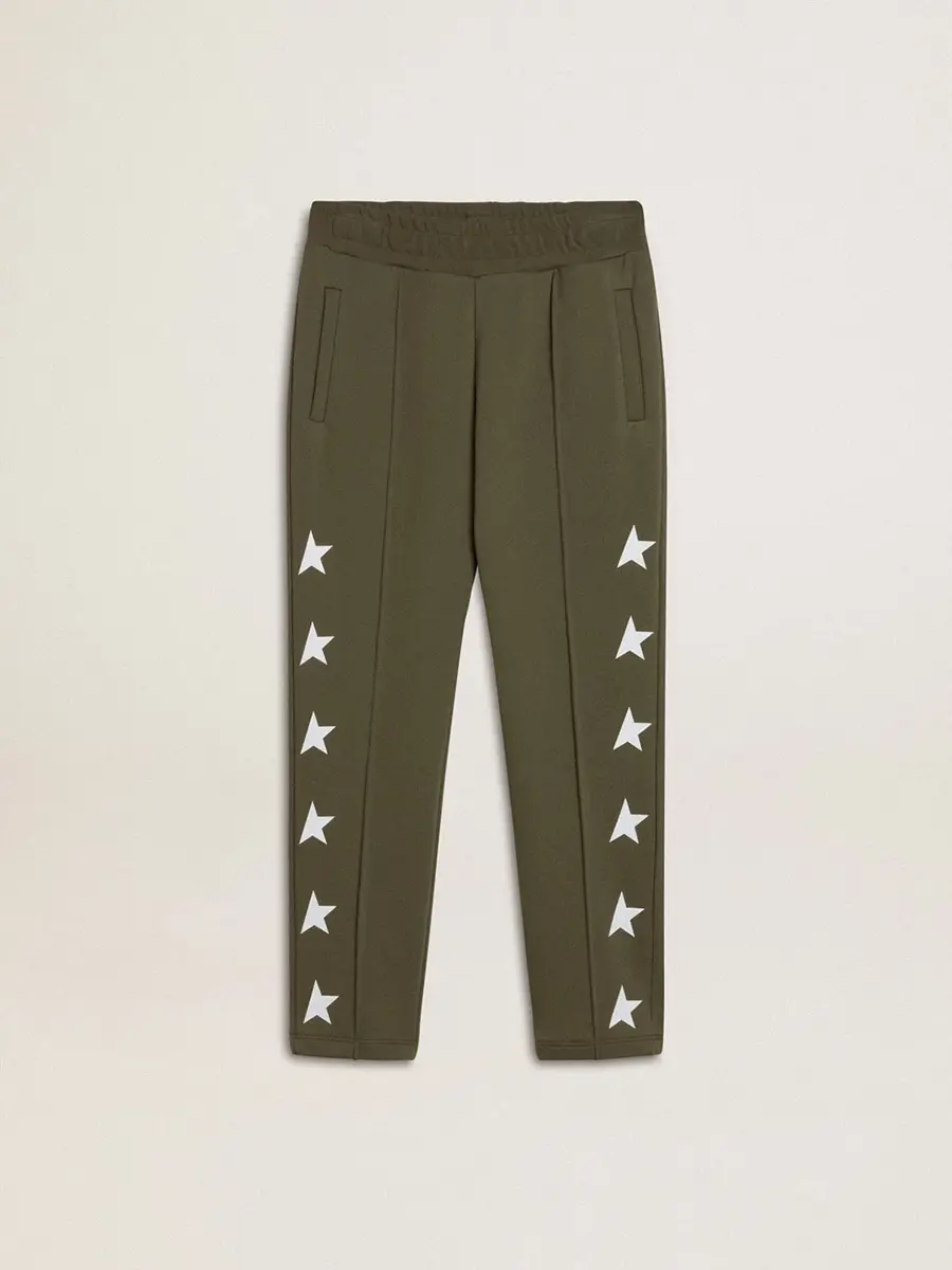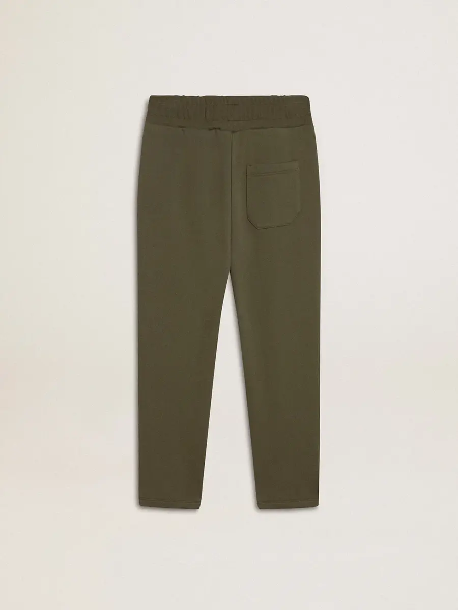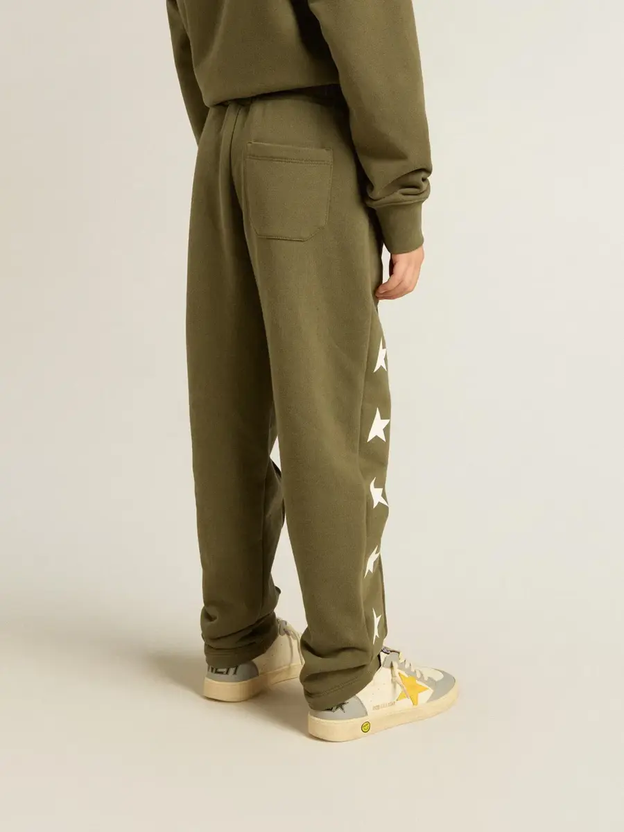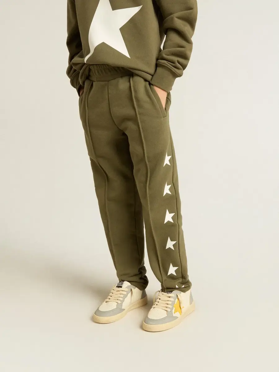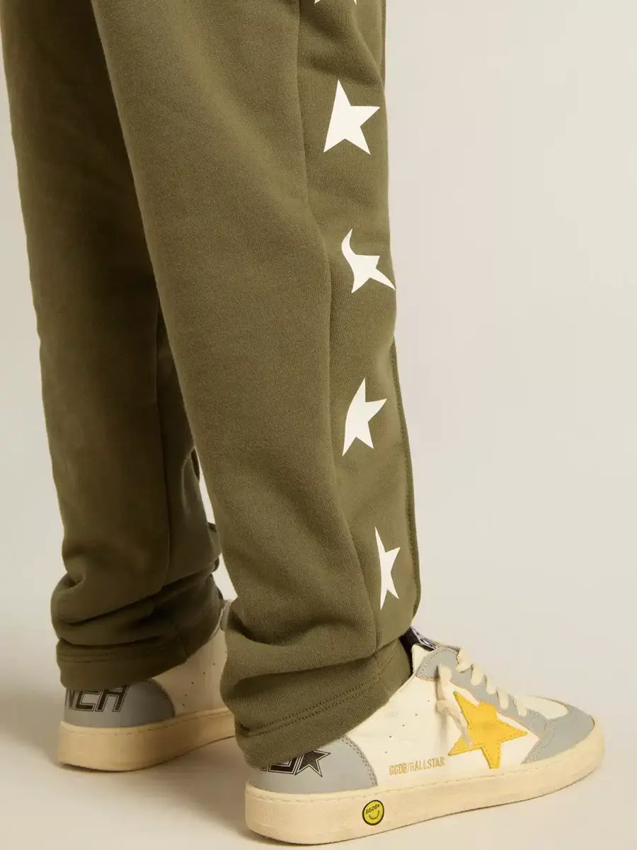 Una colección con un espíritu informal pero versátil: inspirada en los años setenta, tiene un atractivo vintage atemporal, adecuado para cualquier ocasión o look. Inspirados en el mundo de la sastrería, con pliegues cosidos en la parte delantera, estos pantalones de chándal para niño de algodón puro en verde militar presentan un corte ajustado en las piernas. Las estrellas blancas en contraste en los laterales de las piernas añaden el toque final.
