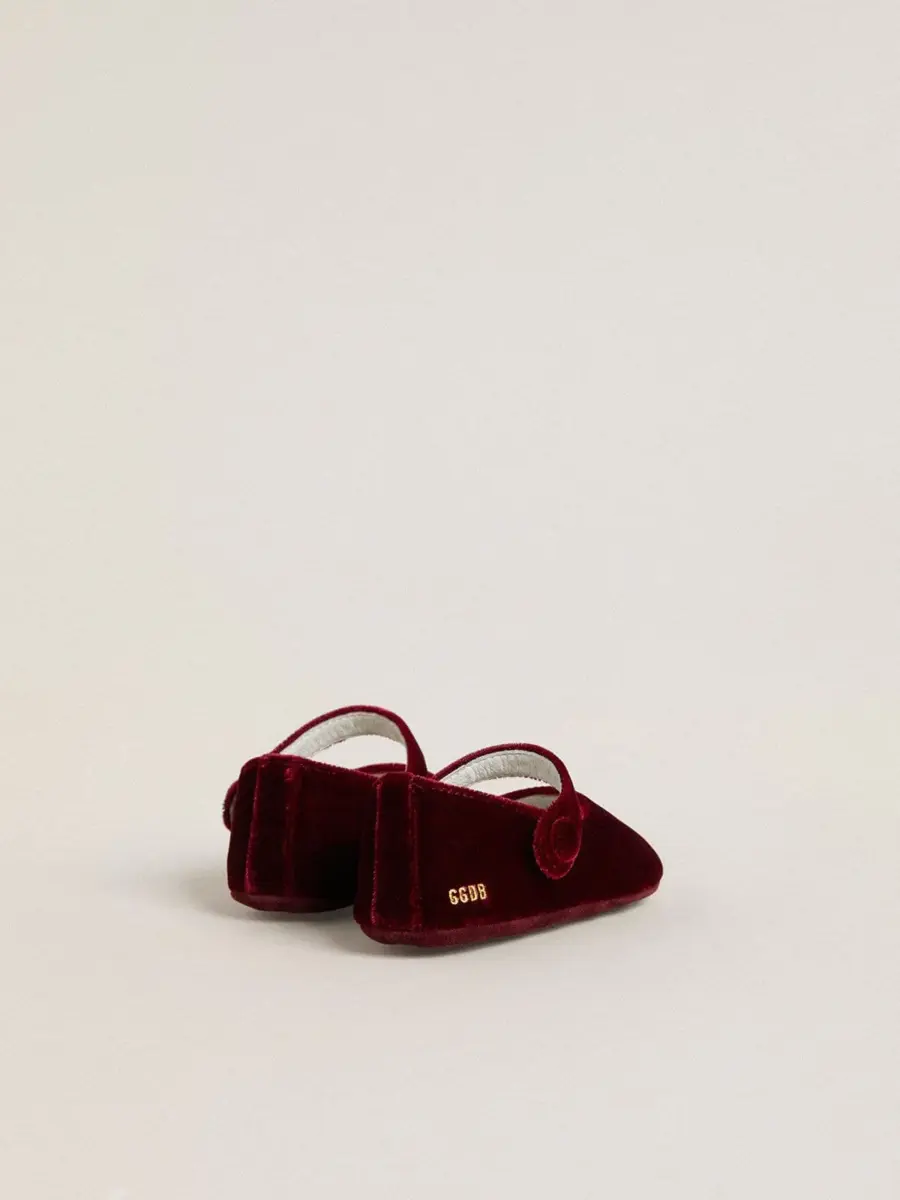 Versión mini de un diseño icónico, las bailarinas Sofi interpretan la elegancia dorada en estilo Baby. Una forma sencilla que combina comodidad y estilo, para acompañarlas de forma natural desde el principio.Esta versión en terciopelo y ante burdeos presenta una silueta plana con una correa y un botón lateral, y una suela con efecto texturizado y estrellas en relieve.