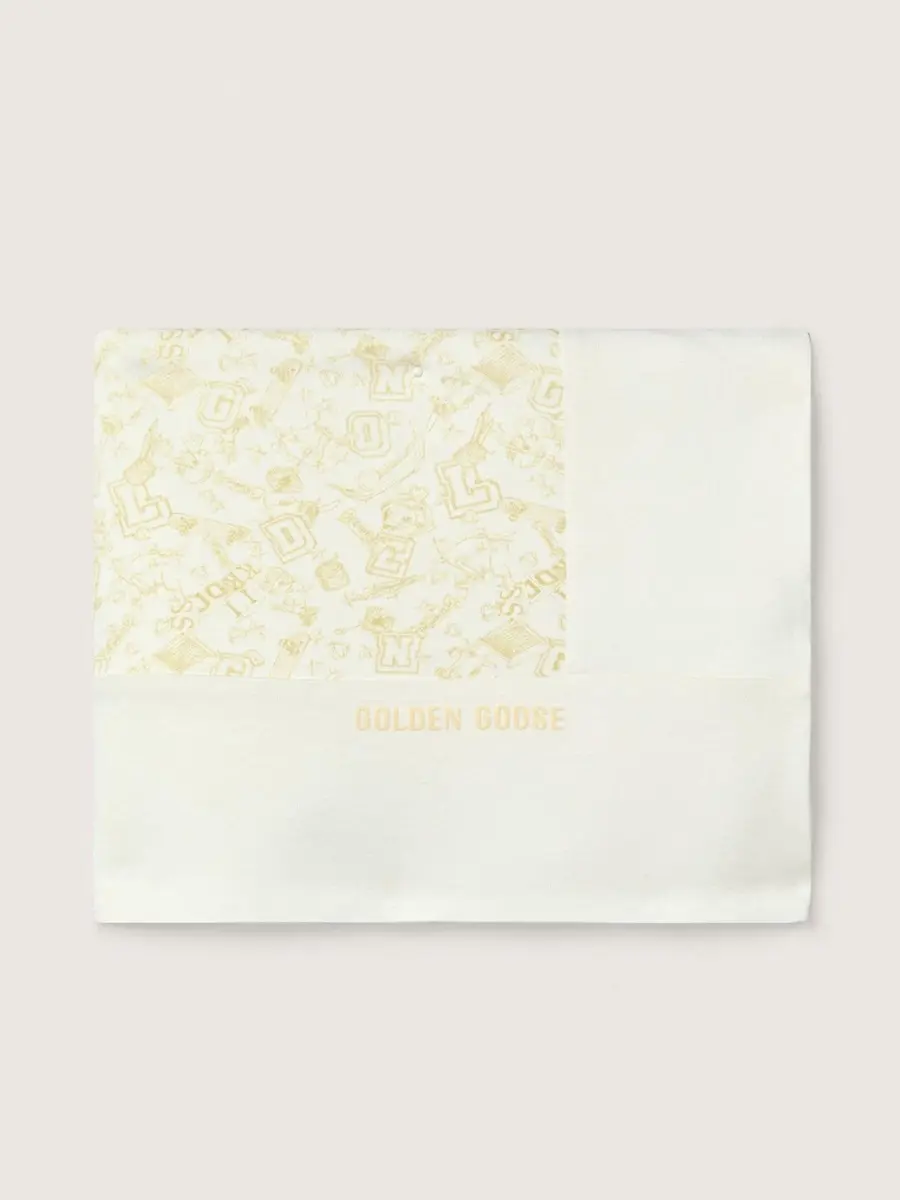 Una colección creada para estar siempre a tu lado, lista para acompañarte en días soleados y aventuras inolvidables. Confeccionada en felpa de algodón blanco, esta manta para bebé presenta un estampado de mascotas en color rosa melocotón por toda la superficie y el logotipo de Golden Goose impreso en el dobladillo.