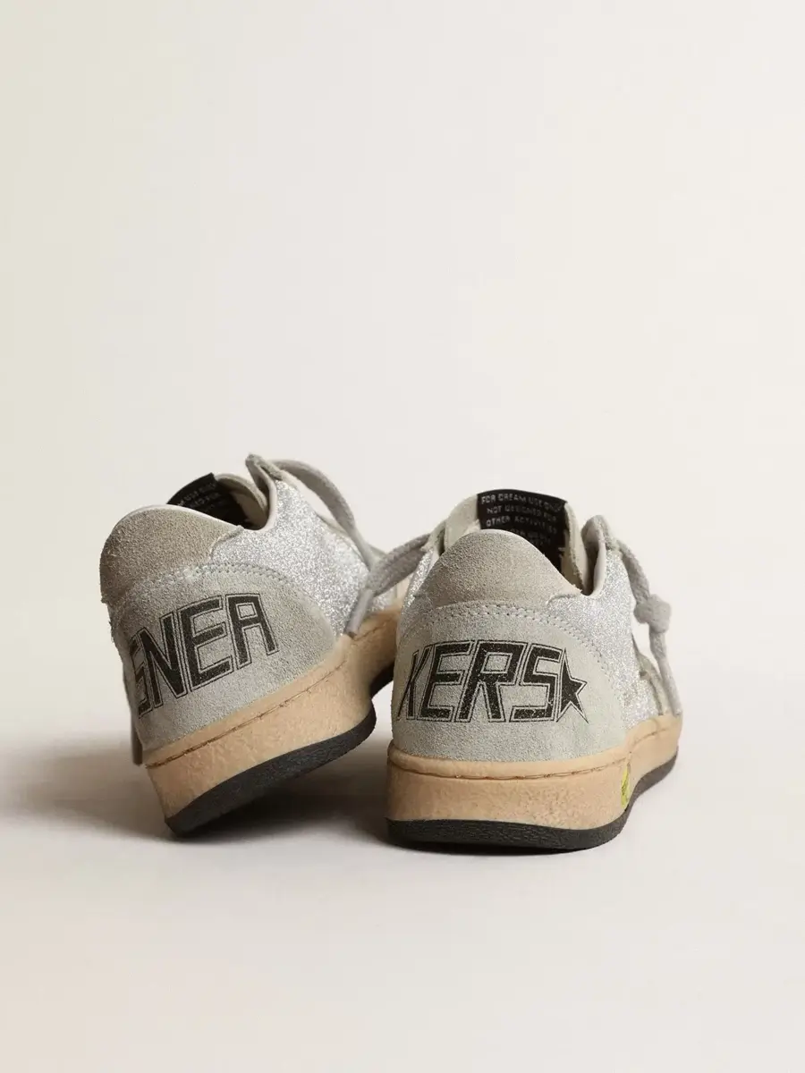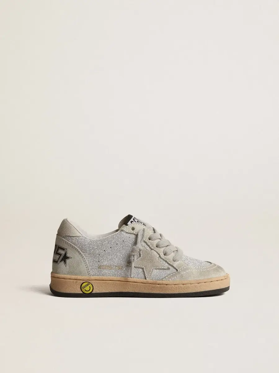Soñando con los años ochenta. Nuestras zapatillas Ball Star tienen un aire universitario americano, a caballo entre el baloncesto y el skate. Con una parte superior de microglitter plateado, la versión Young de este modelo cuenta con inserciones de ante gris hielo, incluyendo la estrella y la lengüeta del talón. El detalle sonriente en el ribete y los cordones gris hielo añaden el toque final: cosas bonitas que nunca pasan de moda.