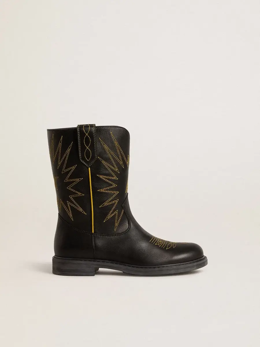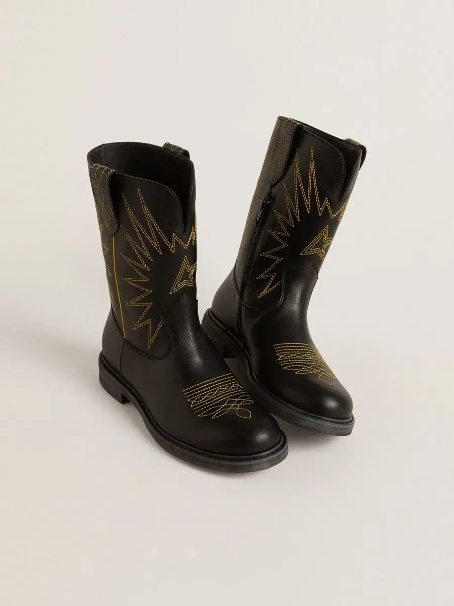 Inspiradas en la imaginería western, estas botas Wish capturan el encanto de las grandes aventuras y la comodidad de la vida cotidiana. Una silueta clásica que, con costuras decorativas y volúmenes atemporales, crece con ellas. Con una parte superior de piel negra acentuada por ribetes amarillos, esta versión Junior presenta un motivo bordado en forma de estrella amarilla en la pierna, costuras en contraste en la puntera y una suela de goma con acabado antideslizante.