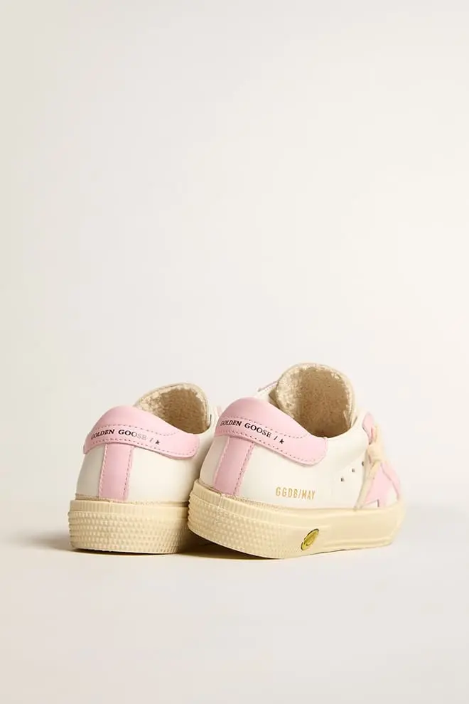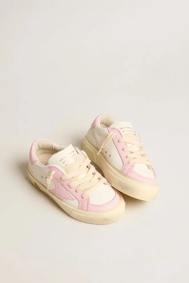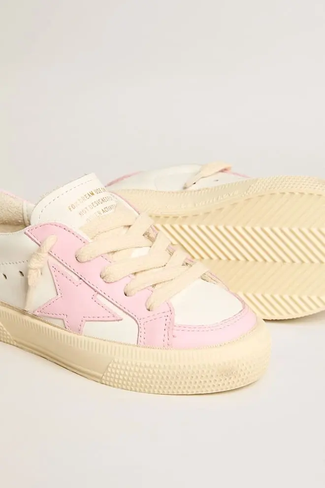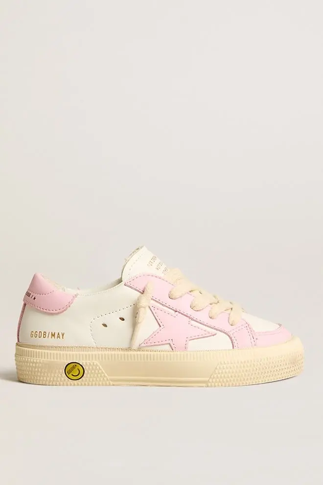 La inspiración de los años setenta y el estilo vintage se unen a la artesanía típica de nuestras zapatillas. Esta versión Teen de las zapatillas May presenta una parte superior de piel blanca y rosa con una estrella y una lengüeta en el talón de piel rosa. El smiley en contraste en la banda lateral, la inserción de piel rosa en la parte trasera y los cordones de color crema completan el estilo.