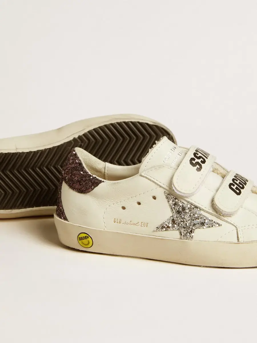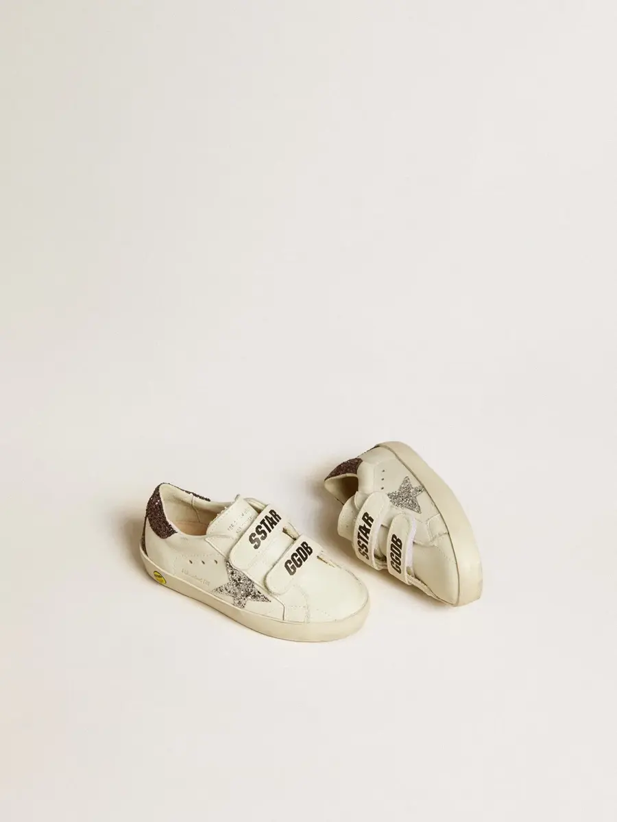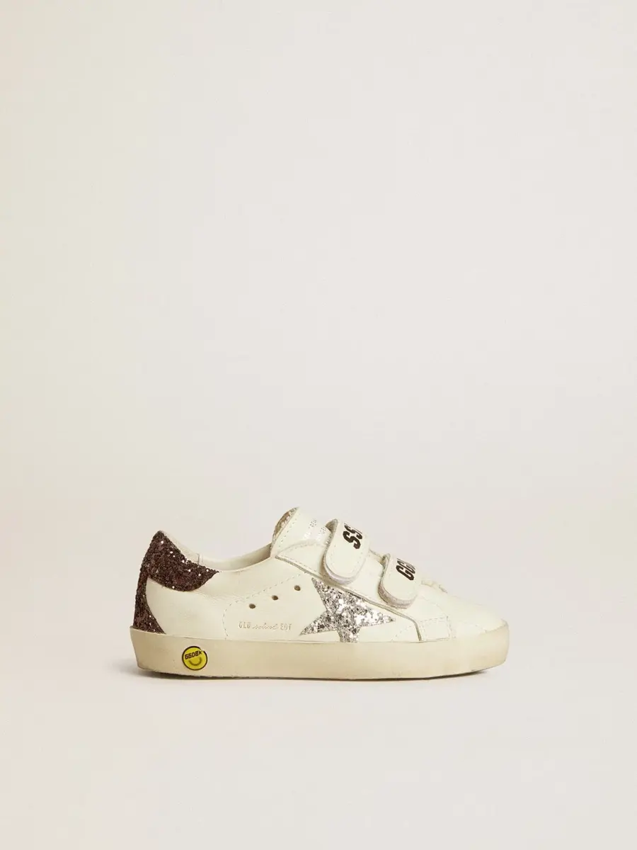 Nuestras zapatillas Old School cuentan con dos tiras de velcro en la parte delantera con el logotipo en contraste. La versión Young de este modelo en piel blanca brilla con una estrella plateada brillante e inserciones marrones brillantes, incluida la lengüeta del talón. El detalle sonriente en el ribete añade el toque final.