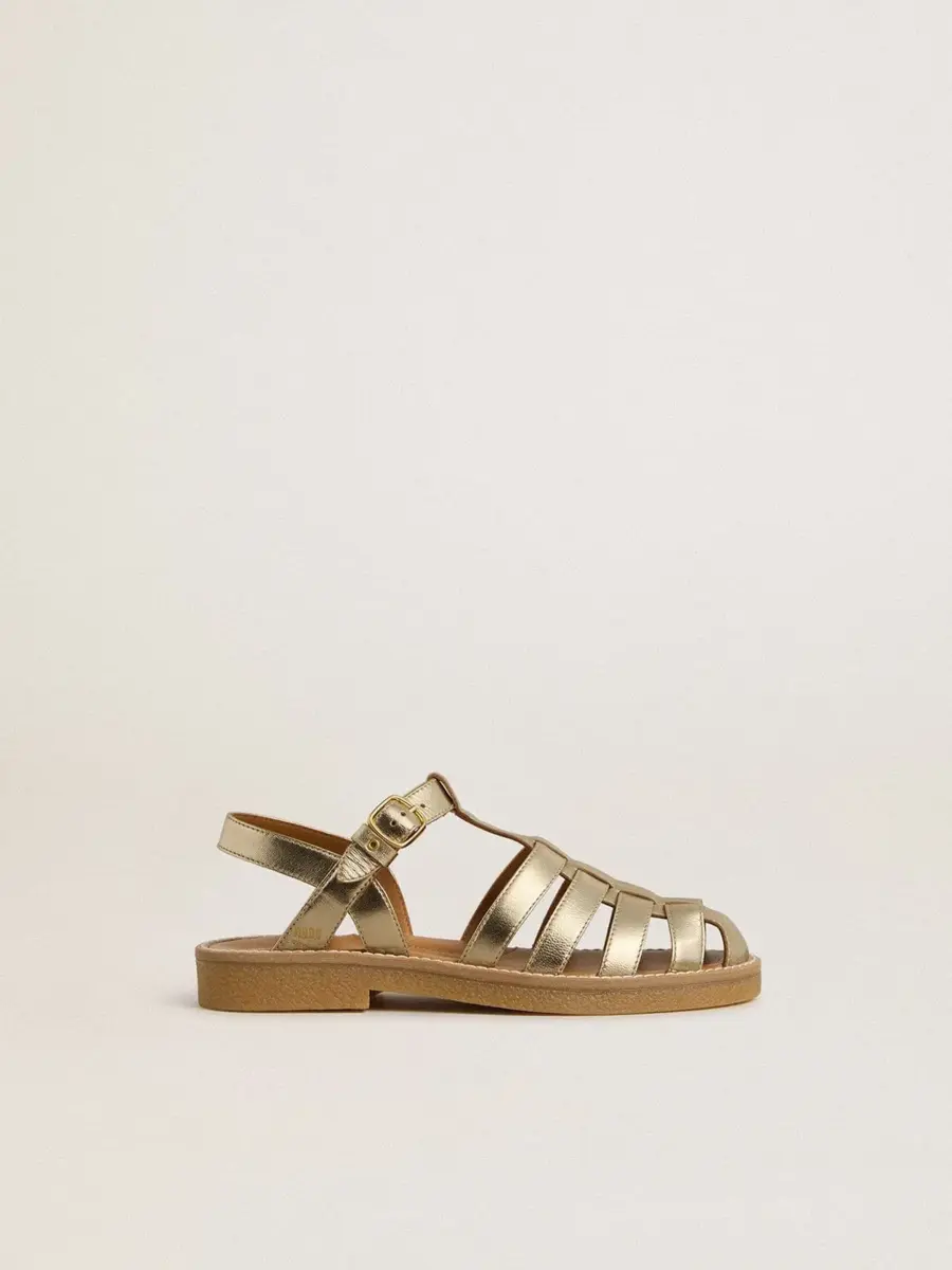 Diseñadas para pequeños exploradores con paso firme, las sandalias Maxime combinan líneas clásicas y un estilo contemporáneo. Un diseño que aúna funcionalidad y libertad de movimiento, acompañándoles en el placer del descubrimiento. Esta versión Junior en piel metalizada dorada presenta un diseño con tiras, cierre lateral con hebilla y suela de goma antideslizante, perfecta para acompañar cualquier aventura.