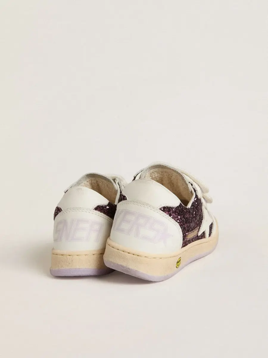 Soñando con los años ochenta. Nuestras zapatillas Ball Star tienen un aire universitario americano, a medio camino entre el baloncesto y el skate. La versión Teen de este modelo, con la parte superior en purpurina morada, cuenta con una estrella de cuero blanco y una lengüeta en el talón. El cierre de velcro de cuero blanco y el detalle de la sonrisa en el ribete añaden el toque final: cosas bonitas que nunca pasan de moda.