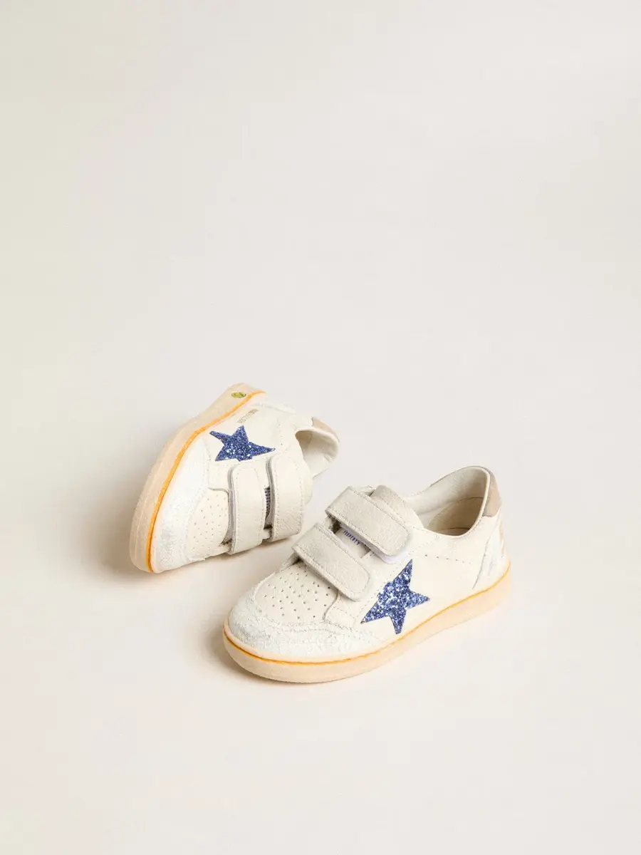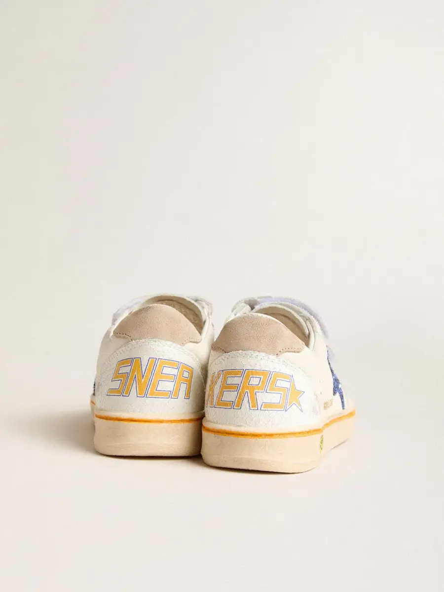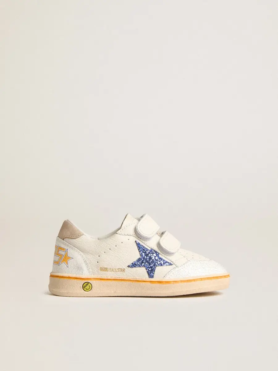 Soñando con los años ochenta. Nuestras zapatillas Ball Star tienen un aire universitario americano, a caballo entre el baloncesto y el skate. Con una parte superior de piel napa blanca, la versión Young de este modelo cuenta con una estrella de piel azul brillante y una lengüeta de ante beige en el talón. El smiley en el ribete y los detalles naranjas le dan el toque final.