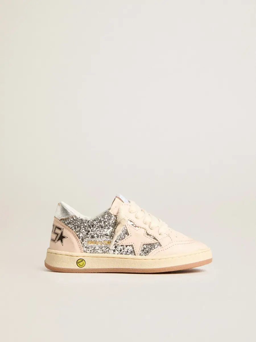 Soñando con los años ochenta. Nuestras zapatillas Ball Star tienen un aire universitario americano, a caballo entre el baloncesto y el skate. Con una parte superior plateada brillante, la versión Young de este modelo cuenta con una estrella de ante rosa pálido y una lengüeta del talón de cuero metalizado plateado. El detalle sonriente en el ribete le da el toque final.