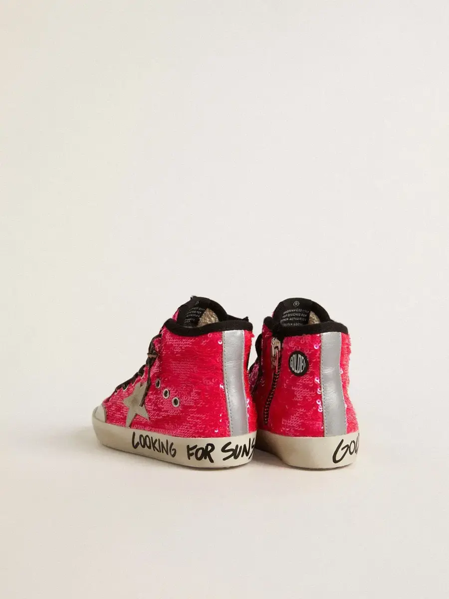 Los años setenta, hoy: inspiradas en el mundo del baloncesto, las zapatillas Francy se actualizan con detalles inesperados y acabados especiales. La versión Young de estas zapatillas, con la parte superior de lentejuelas fucsias, cuenta con una estrella de ante gris hielo y una lengüeta en el talón de piel metalizada plateada con efecto mate. La lengüeta de lentejuelas, las letras negras en contraste en el ribete y los cordones con estampado animal en beige y marrón completan el look.