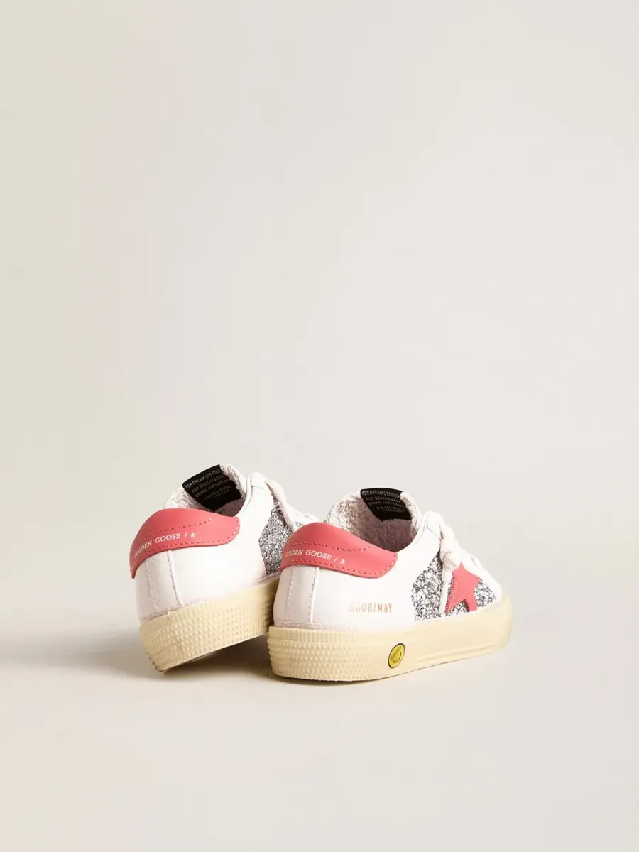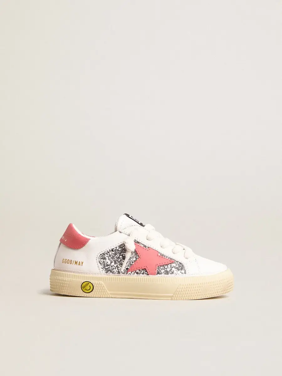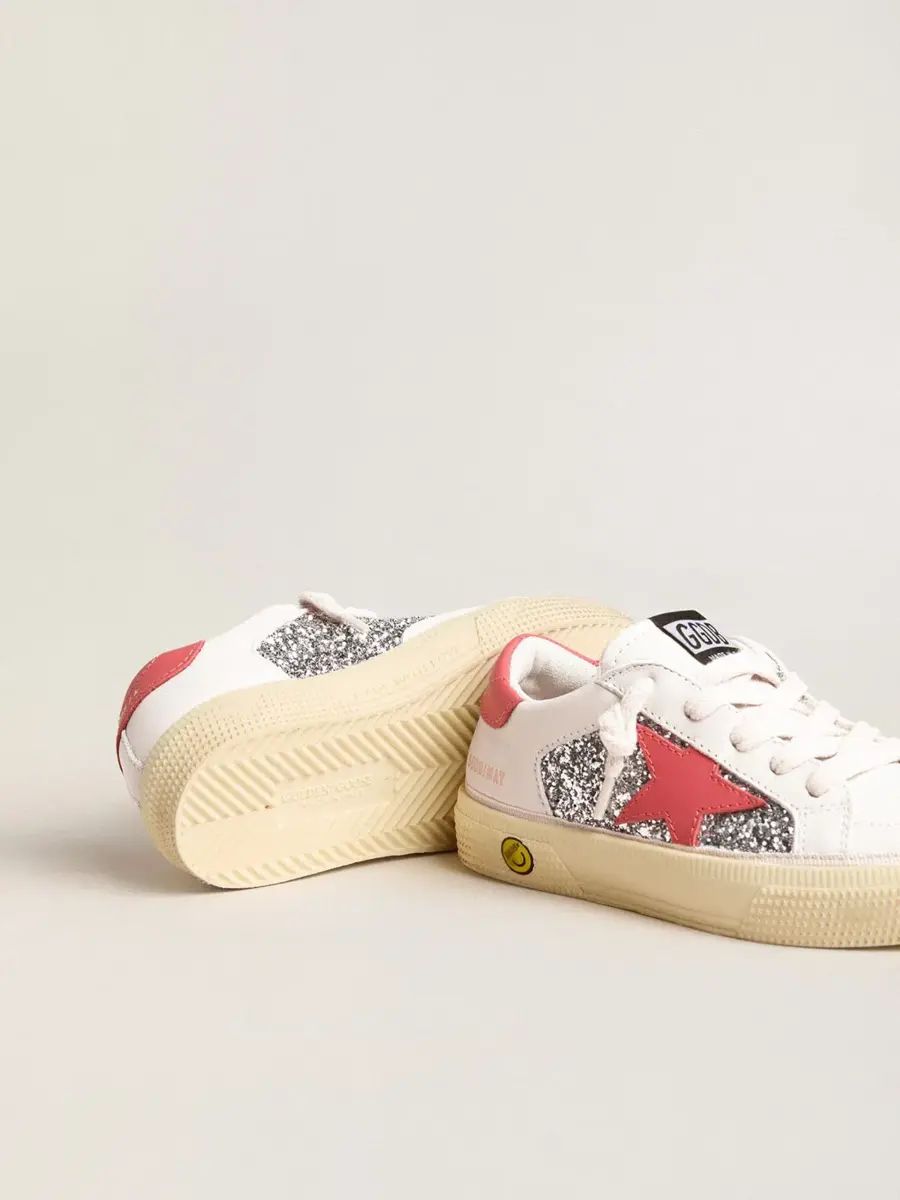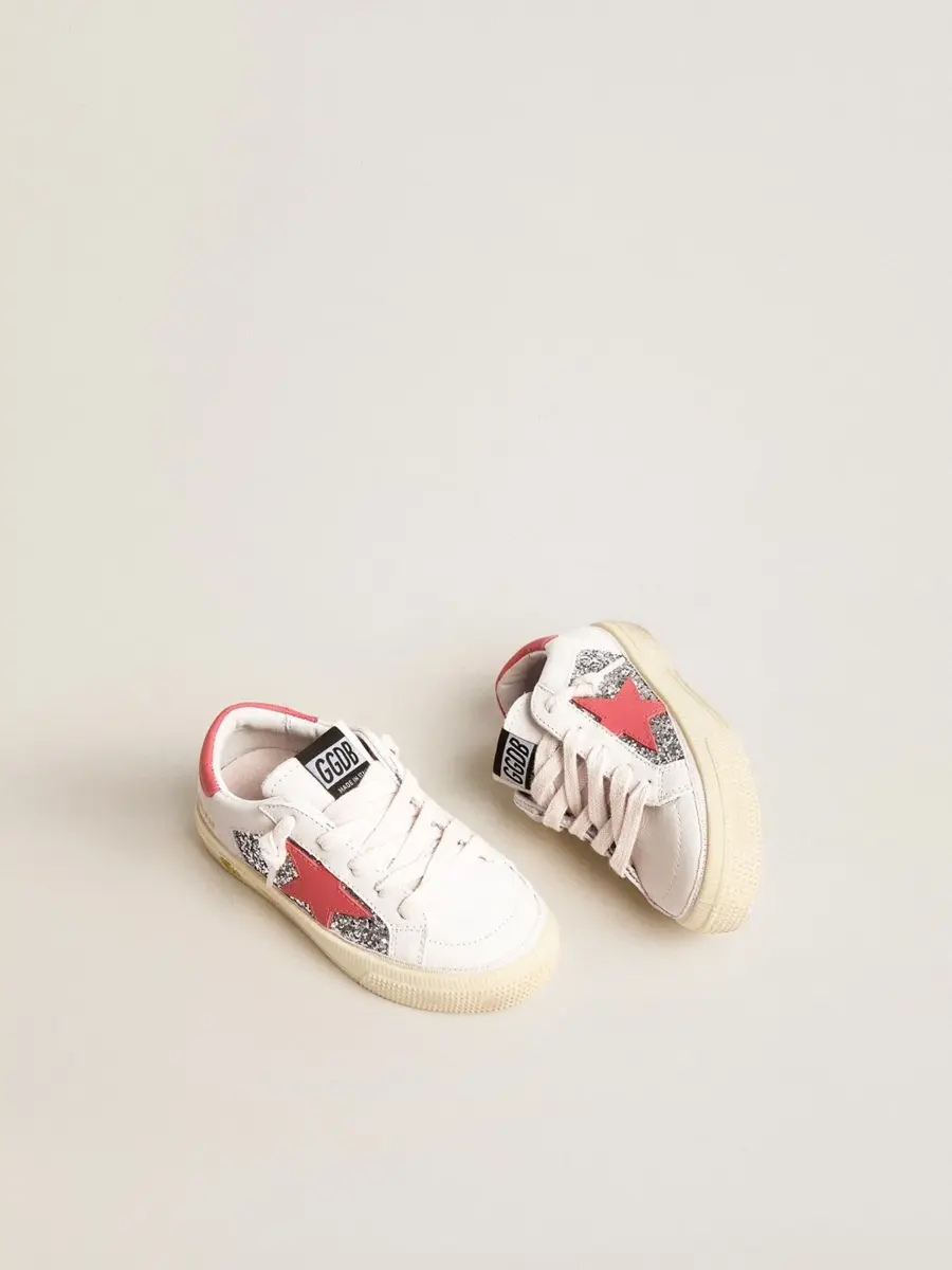 La inspiración de los años setenta y el estilo vintage se unen a la artesanía típica de nuestras zapatillas. Esta versión Young de nuestras zapatillas May presenta una parte superior de cuero blanco con estrella de cuero rojo y lengüeta en el talón de cuero rojo perforado. El detalle sonriente en el ribete y el detalle brillante debajo de la estrella completan el look.