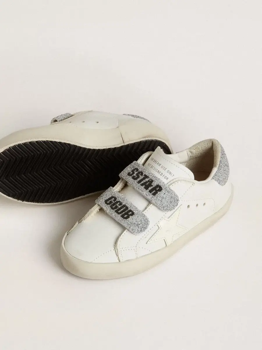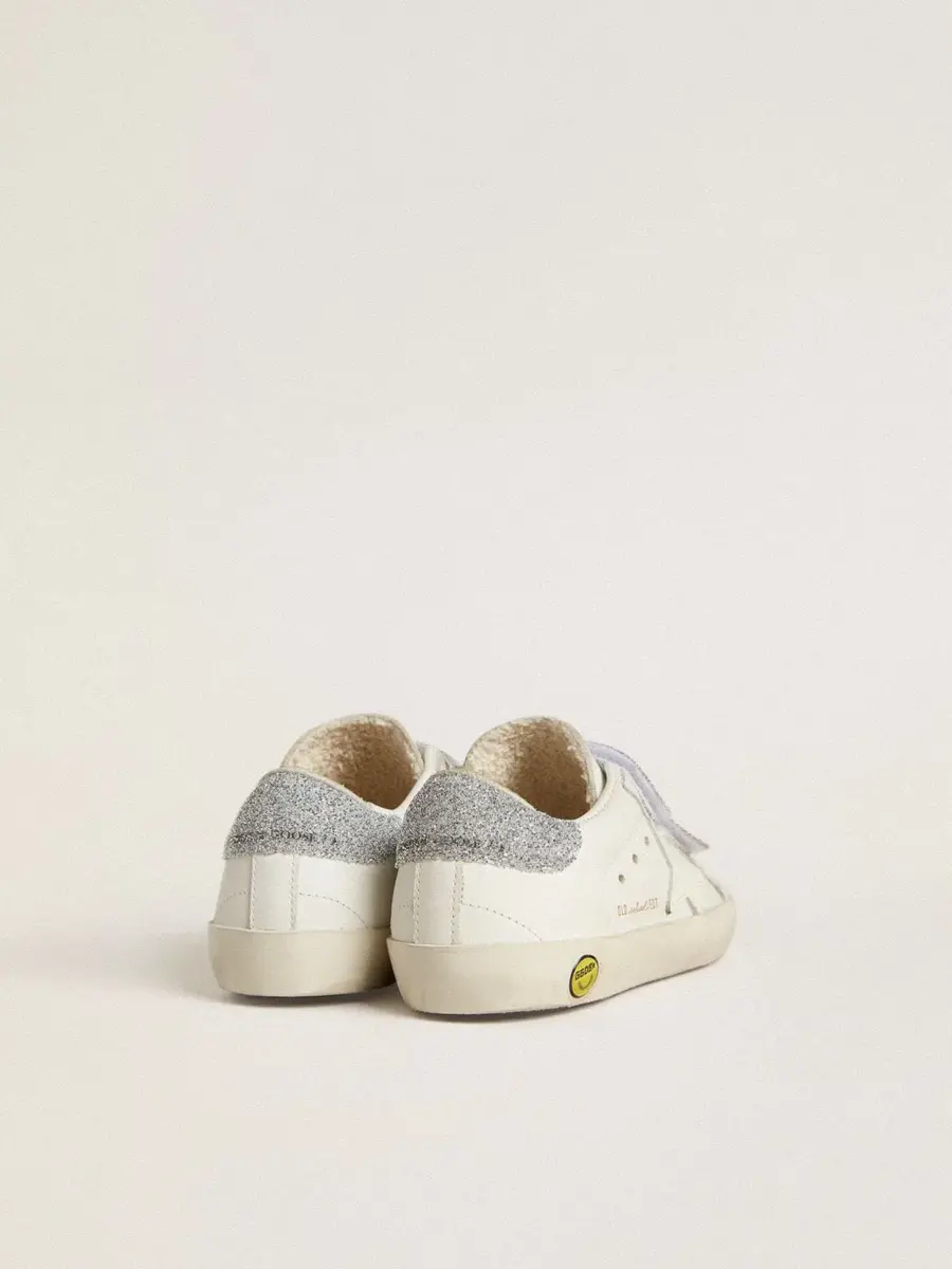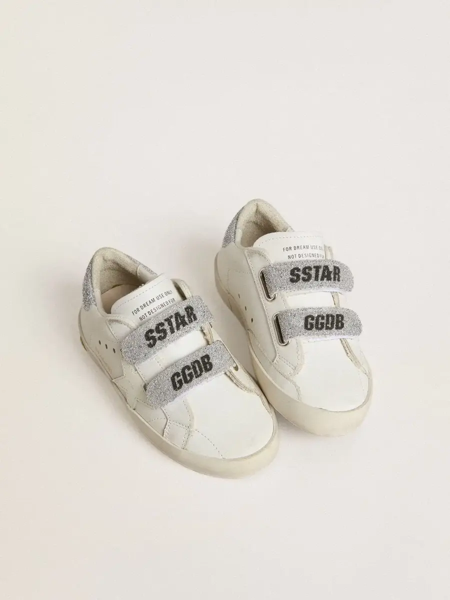 Nuestras zapatillas Old School cuentan con dos tiras de velcro en la parte delantera con el logotipo en contraste. La versión Young de este modelo en piel blanca cuenta con cierre de velcro y lengüeta en el talón iluminada con cristales Swarovski plateados. El detalle del smiley en el ribete completa el look.