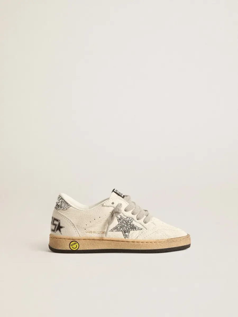Soñando con los años ochenta. Nuestras zapatillas Ball Star tienen un aire universitario americano, a medio camino entre el baloncesto y el skate. La versión Junior de este modelo, con parte superior de piel napa blanca, cuenta con una estrella plateada brillante y lengüeta en el talón. Los cordones gris hielo le dan el toque final: cosas bonitas que nunca pasan de moda.