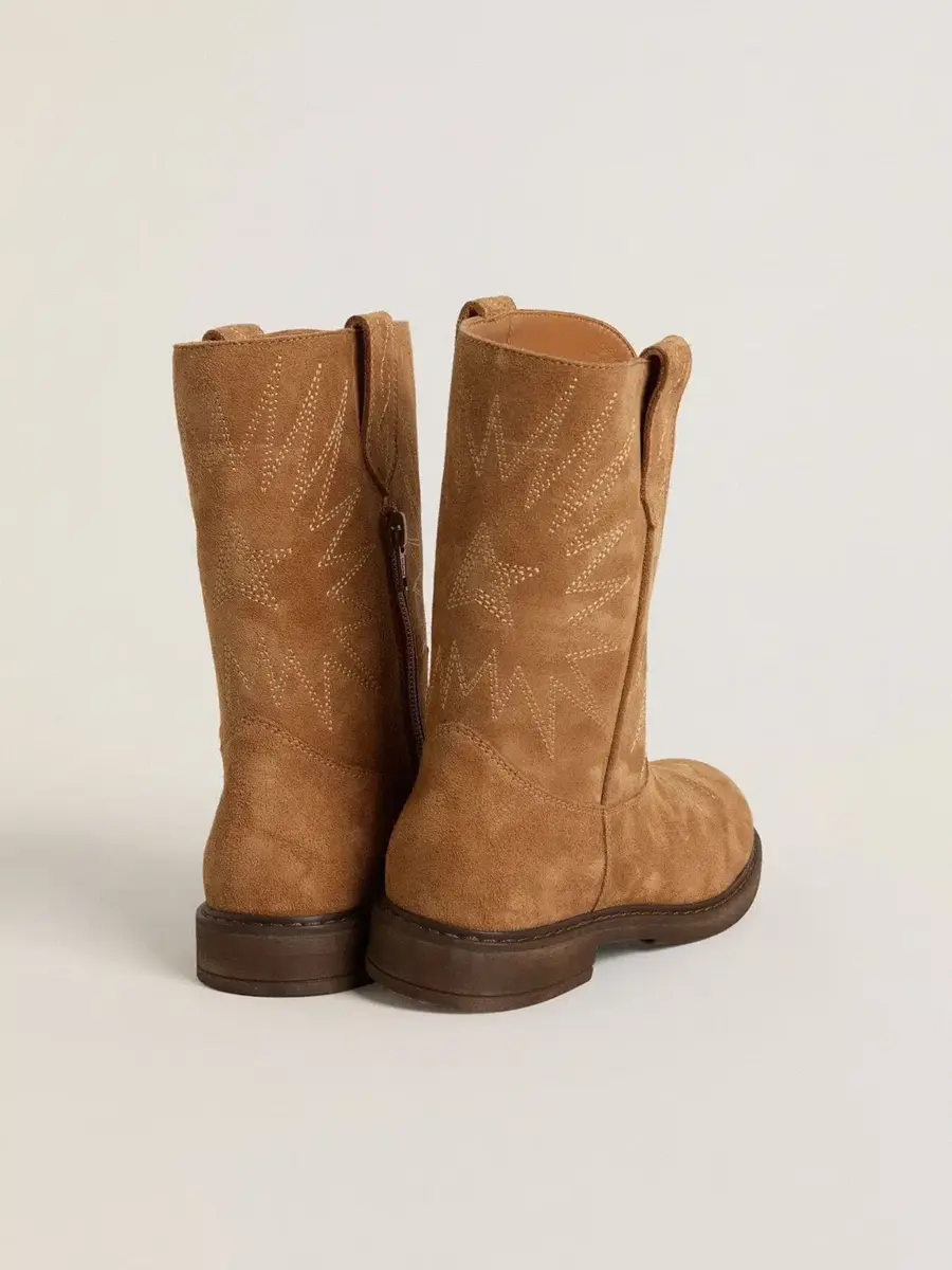 Inspiradas en la imaginería western, estas botas Wish capturan el encanto de las grandes aventuras y la comodidad de la vida cotidiana. Una silueta clásica que, con costuras decorativas y volúmenes atemporales, crece con ellas. Con una parte superior de ante color camel, esta versión Young presenta un motivo bordado en forma de estrella en la pierna, costuras tono sobre tono en la puntera y una suela de goma con acabado antideslizante.