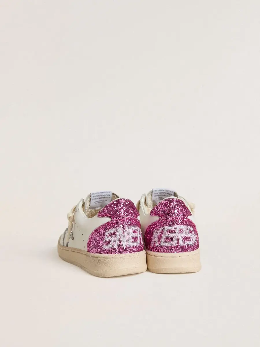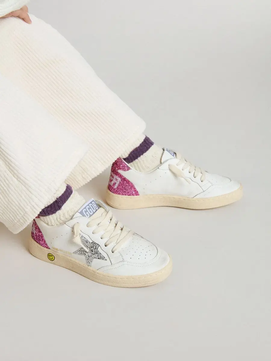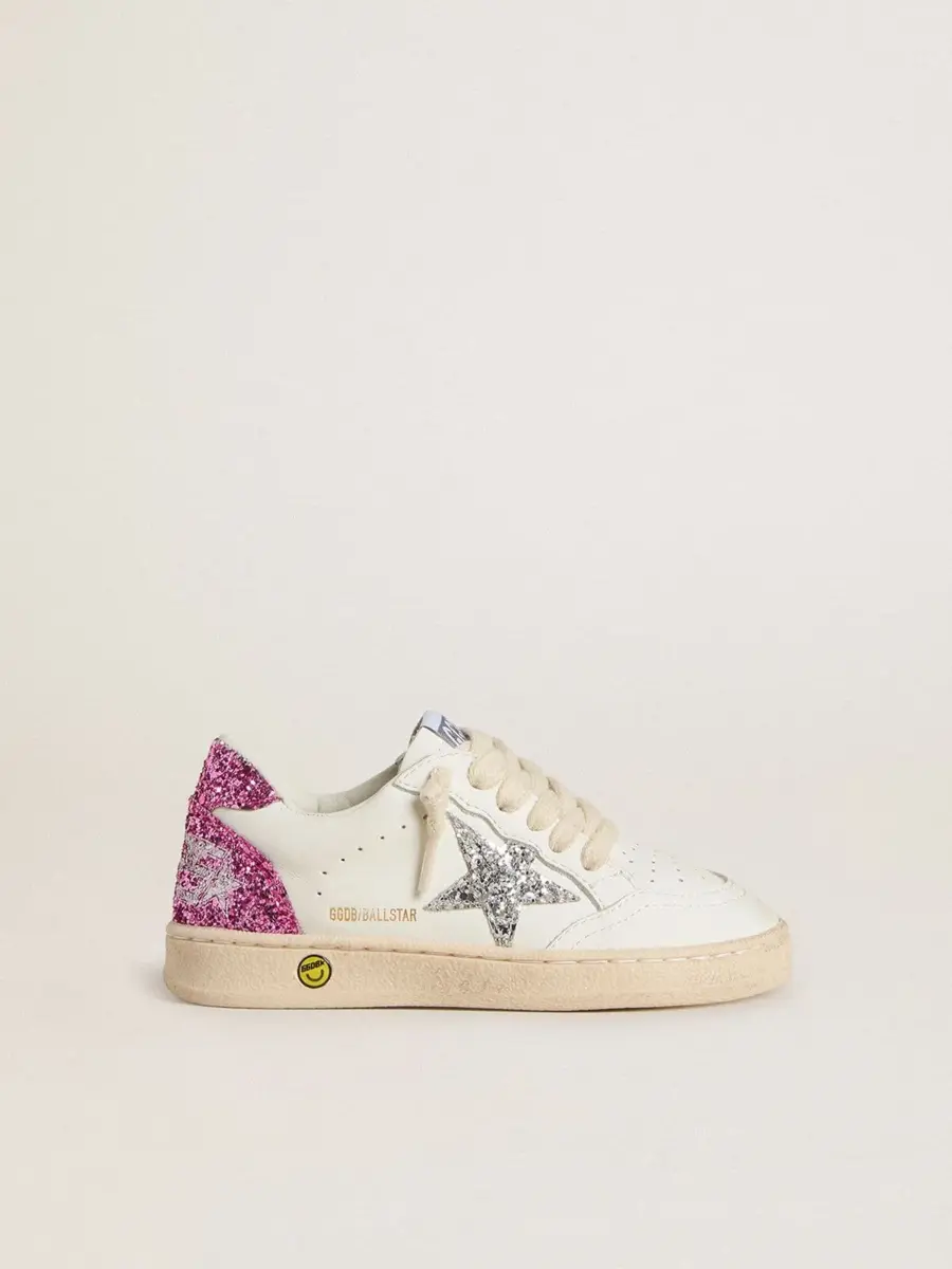 Soñando con los años ochenta. Nuestras zapatillas Ball Star tienen un aire universitario americano, a caballo entre el baloncesto y el skate. La versión Junior de este modelo, con parte superior de piel blanca, presenta una estrella plateada brillante y una lengüeta rosa brillante en el talón. La inserción rosa brillante en la parte trasera, el detalle sonriente en el ribete y los cordones de color crema añaden el toque final: cosas bonitas que nunca pasan de moda.