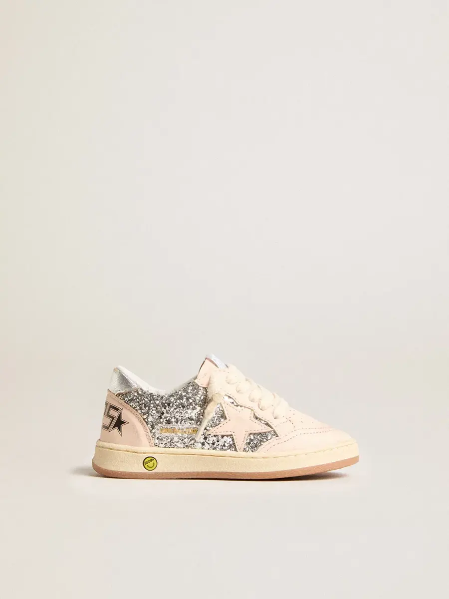 Soñando con los años ochenta. Nuestras zapatillas Ball Star tienen un aire universitario americano, a caballo entre el baloncesto y el skate. Con una parte superior plateada brillante, la versión Junior de este modelo cuenta con una estrella de ante rosa pálido y una lengüeta en el talón de piel metalizada plateada. El detalle sonriente en el ribete le da el toque final.