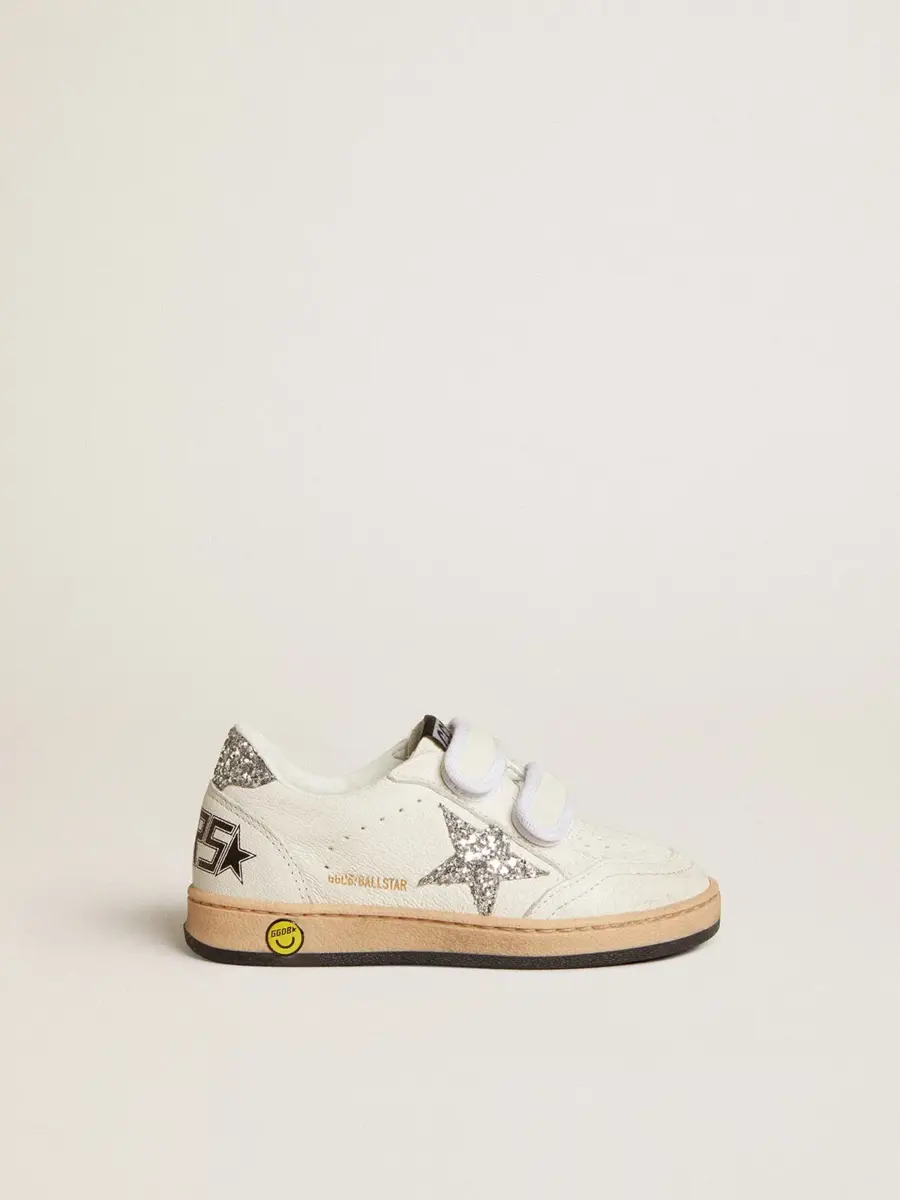 Soñando con los años ochenta. Nuestras zapatillas Ball Star tienen un aire universitario americano, a medio camino entre el baloncesto y el skate. La versión Junior de este modelo, con parte superior de napa blanca, cuenta con una estrella plateada brillante y una lengüeta en el talón. Las tiras de velcro de napa blanca le dan el toque final: cosas bonitas que nunca pasan de moda.