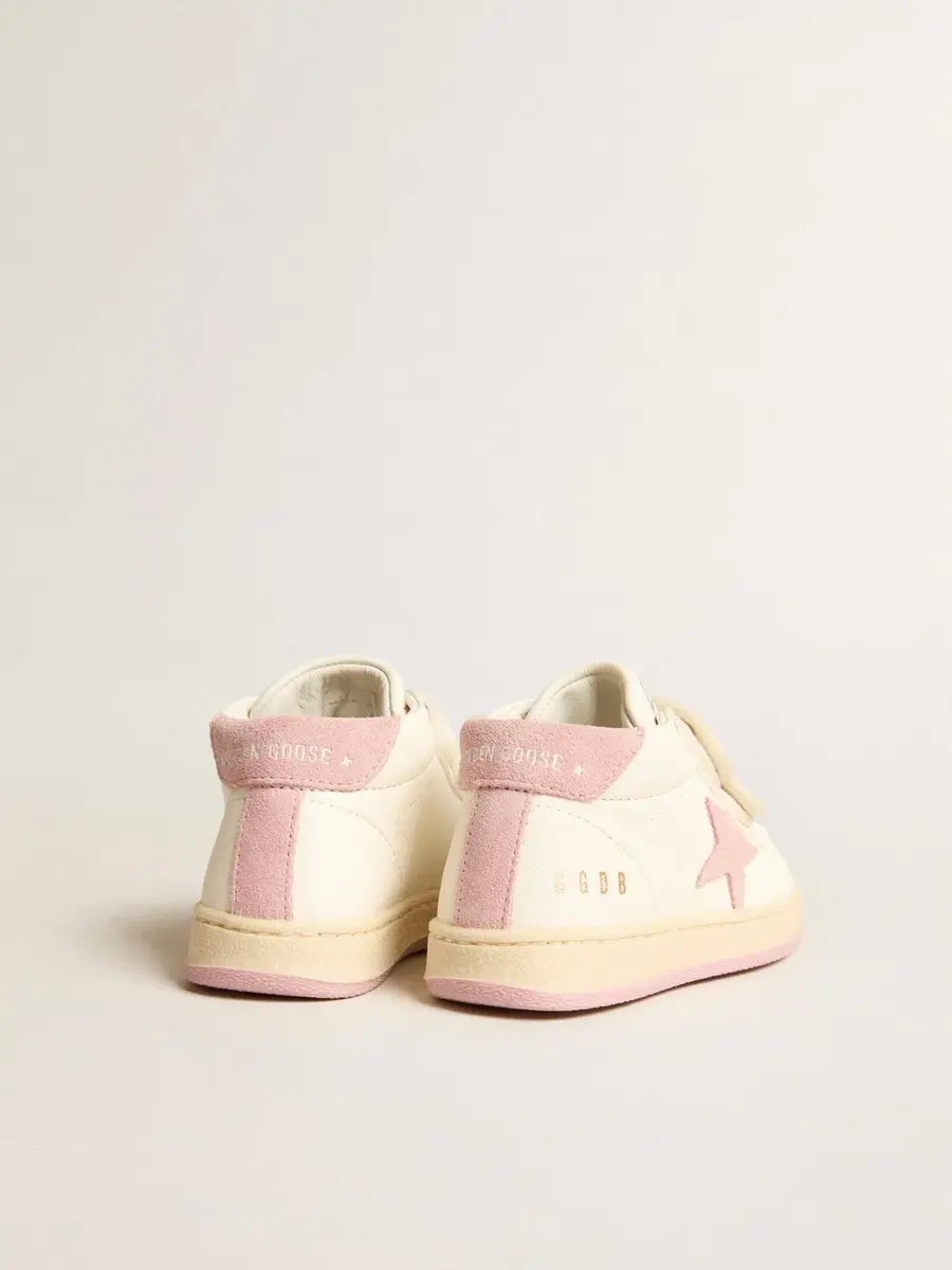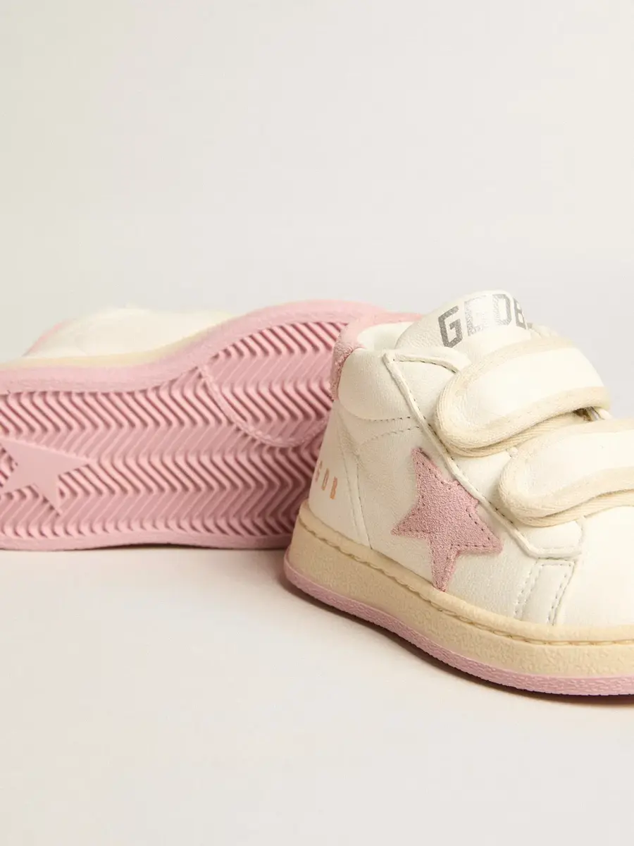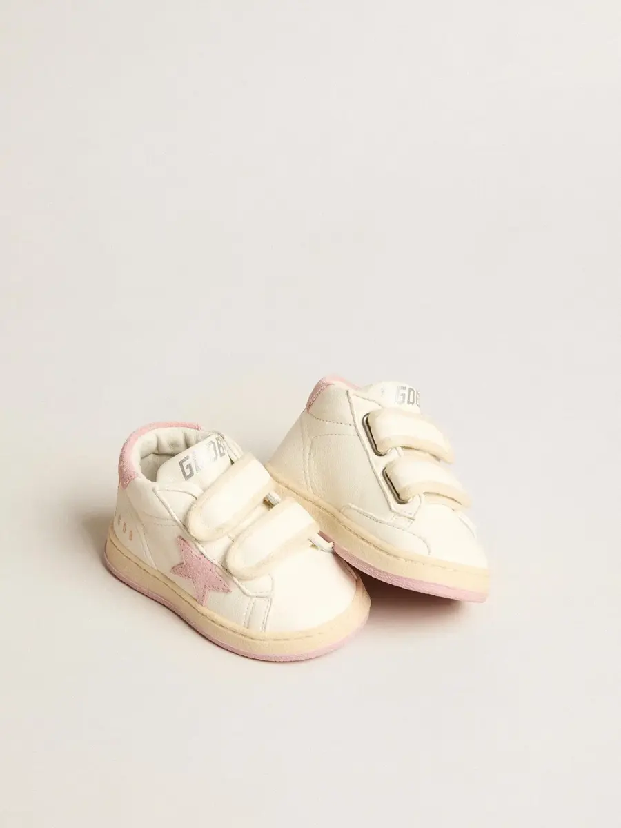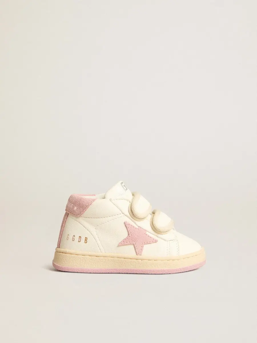 La versión Junior de nuestras zapatillas June cuenta con dos tiras de velcro en la parte delantera. Este modelo con parte superior de napa blanca presenta una estrella y una lengüeta en el talón de ante rosa antiguo. La inserción de ante rosa antiguo en la parte trasera le da el toque final.