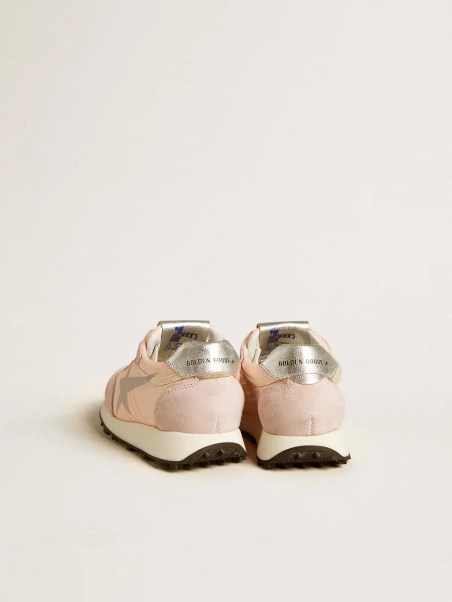 Inspiradas en el atletismo, con un toque setentero. Nuestras nuevas zapatillas Marathon están diseñadas para que puedas perseguir tus sueños día tras día, rindiendo homenaje a la maratón que es la vida. En nailon rosa acentuado con inserciones de ante rosa, la versión Junior de este modelo cuenta con una estrella estampada en plata y una lengüeta en el talón de cuero plateado metalizado. El look se completa con cordones blancos y una suela con estrellas que causan una impresión verdaderamente única.