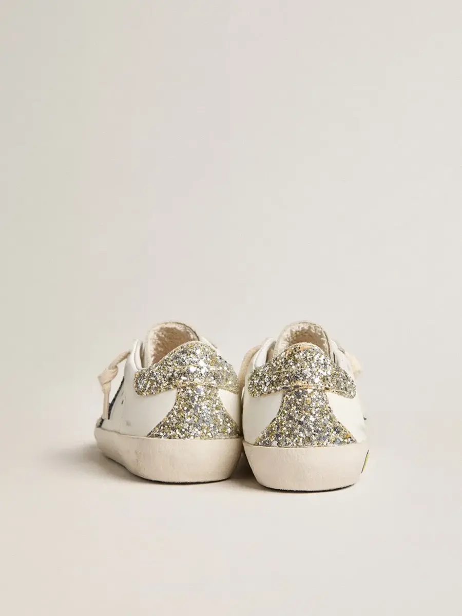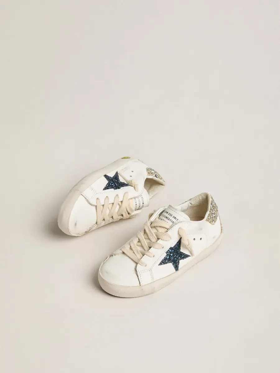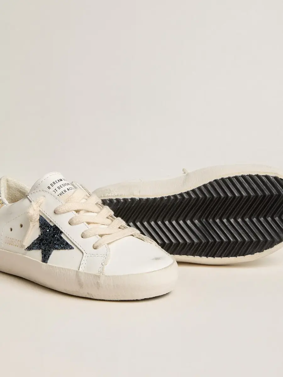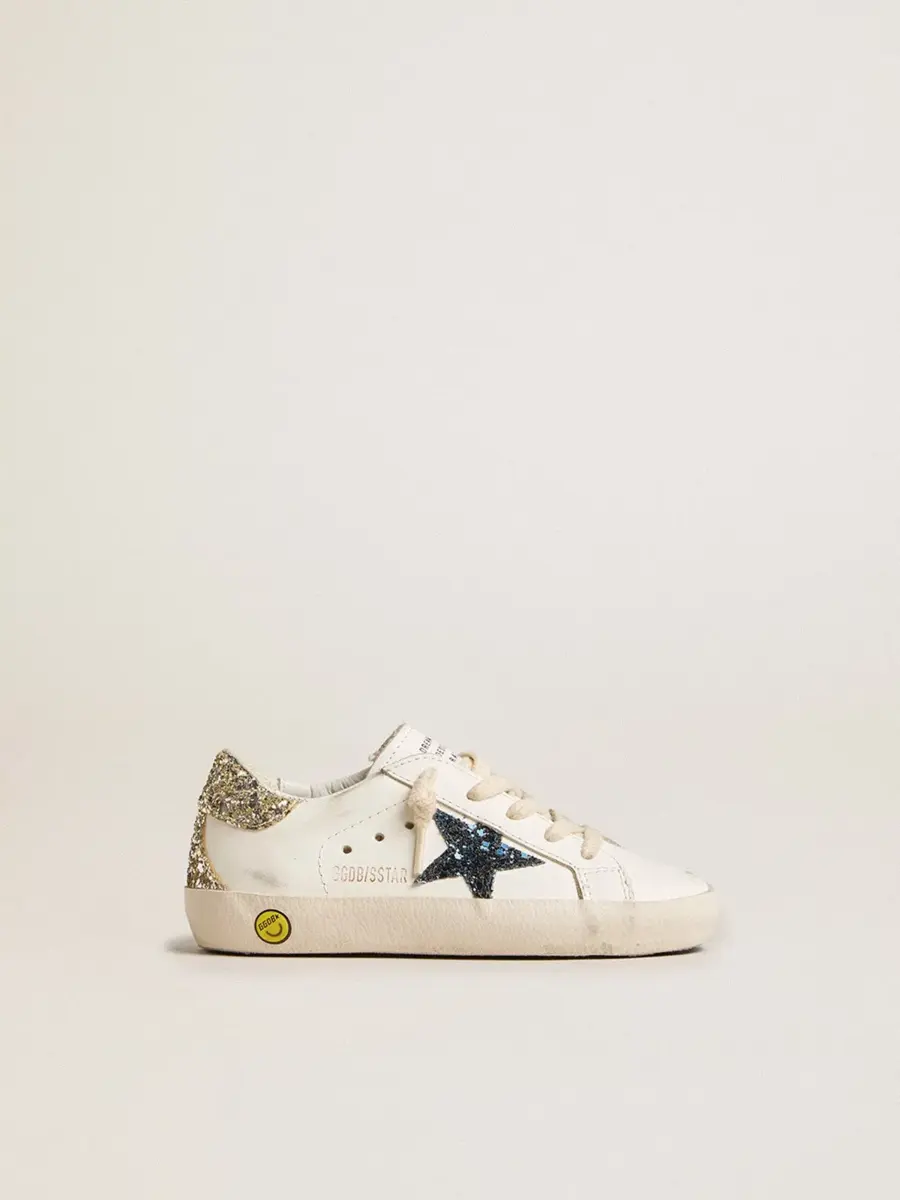 Un icono atemporal, pero en constante evolución. En Golden nos encanta retocar nuestros clásicos constantemente, siempre desde un nuevo ángulo. Esta versión Junior de las Super-Star presenta una parte superior de piel blanca con una estrella azul brillante y una lengüeta en el talón con purpurina platino. El detalle del smiley y los cordones de color crema añaden el toque final.