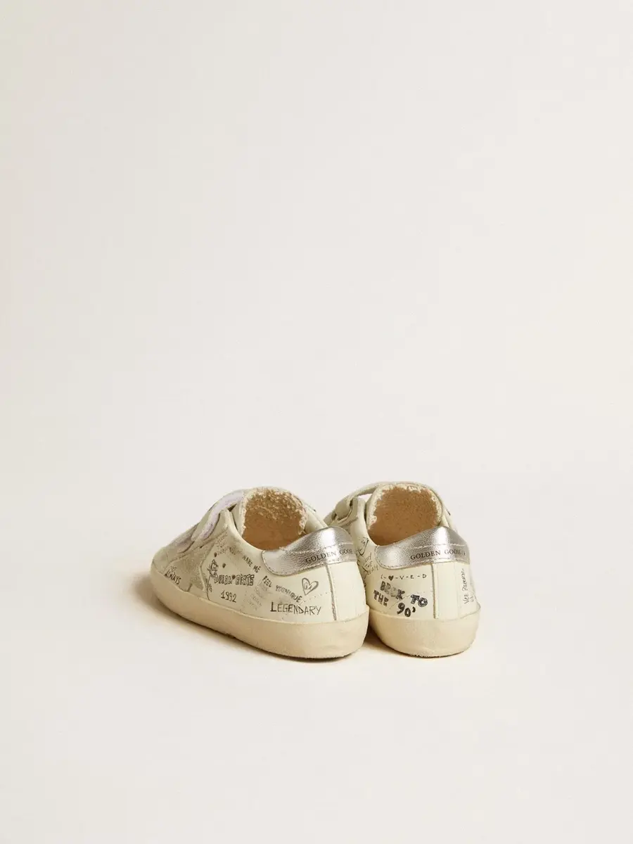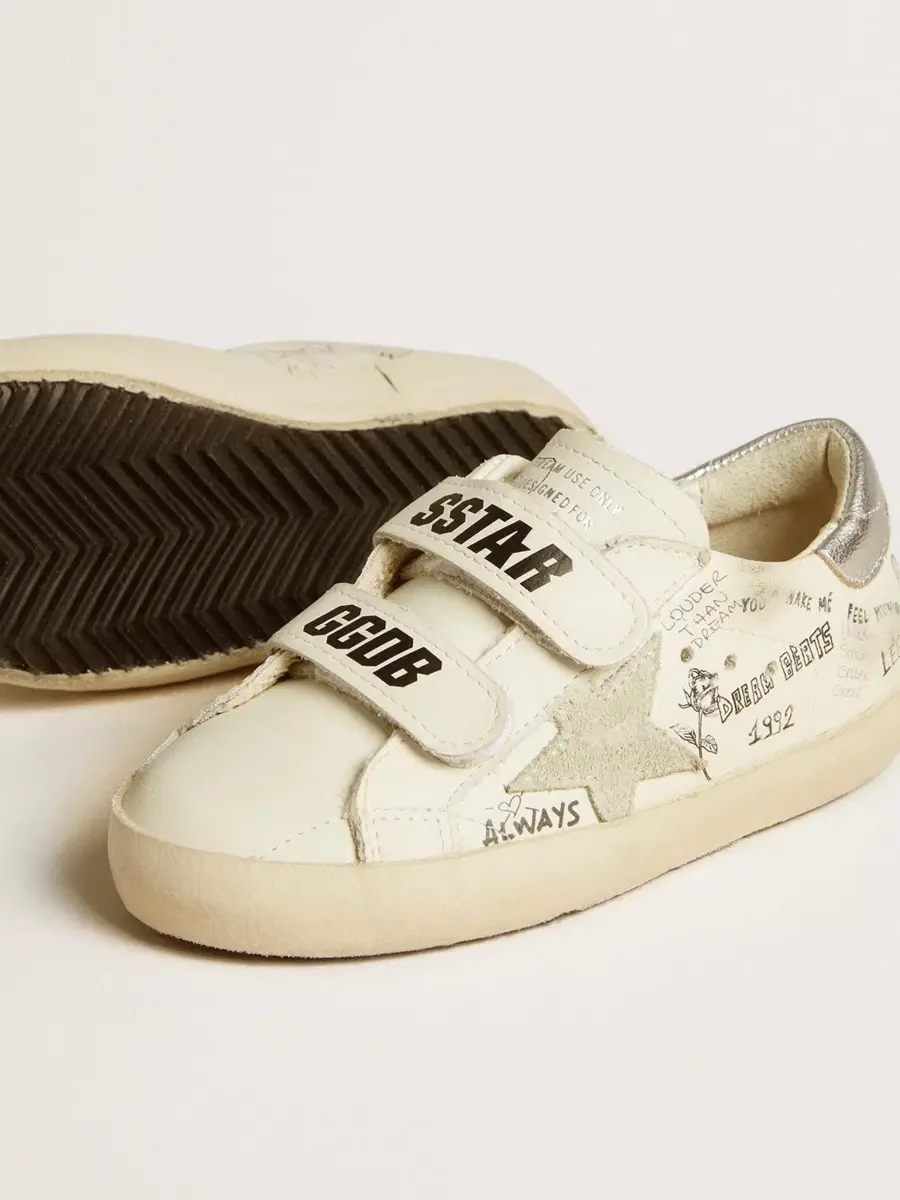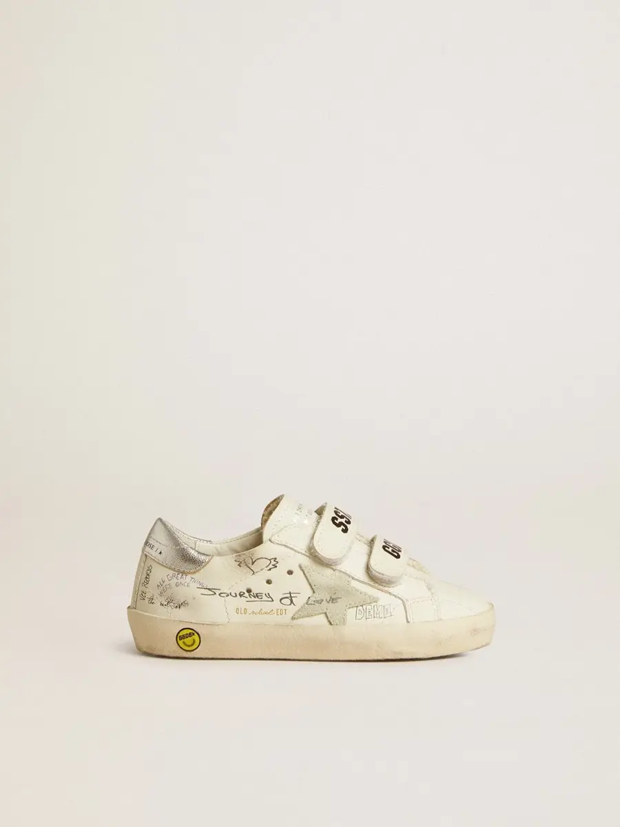 Nuestras zapatillas Old School cuentan con dos tiras de velcro en la parte delantera con el logotipo en contraste. Con una parte superior de cuero blanco acentuada con letras multicolores por toda la superficie, la versión Junior de este modelo cuenta con una estrella de ante gris hielo y una lengüeta de cuero metalizado plateado en el talón.