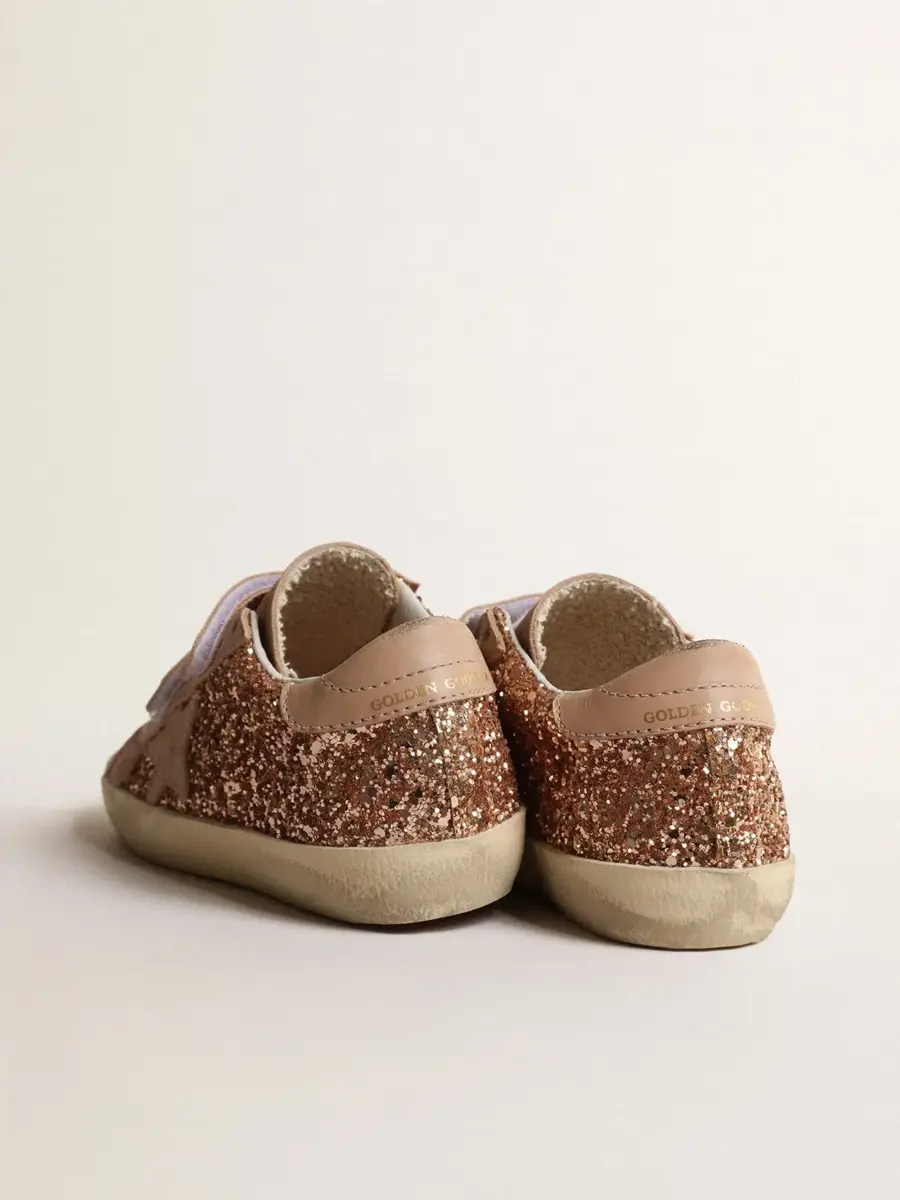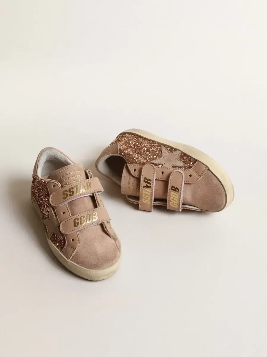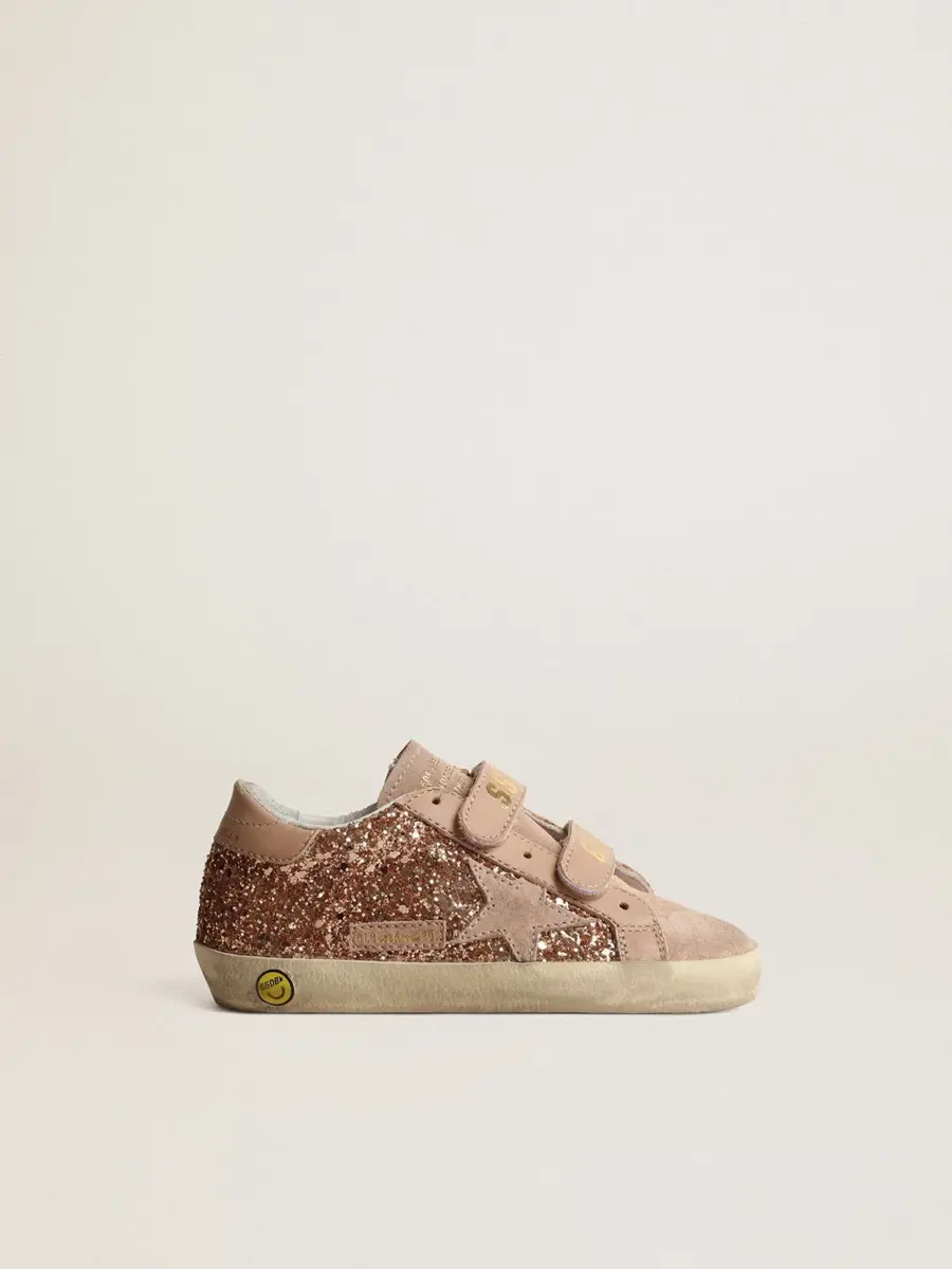 Nuestras zapatillas Old School cuentan con dos tiras de velcro en la parte delantera con el logotipo en contraste. La versión Junior de este modelo en rosa melocotón brillante cuenta con una estrella de ante rosa viejo y una lengüeta de cuero rosa viejo en el talón. La lengüeta de ante rosa viejo y el detalle de la sonrisa en el ribete completan el look.