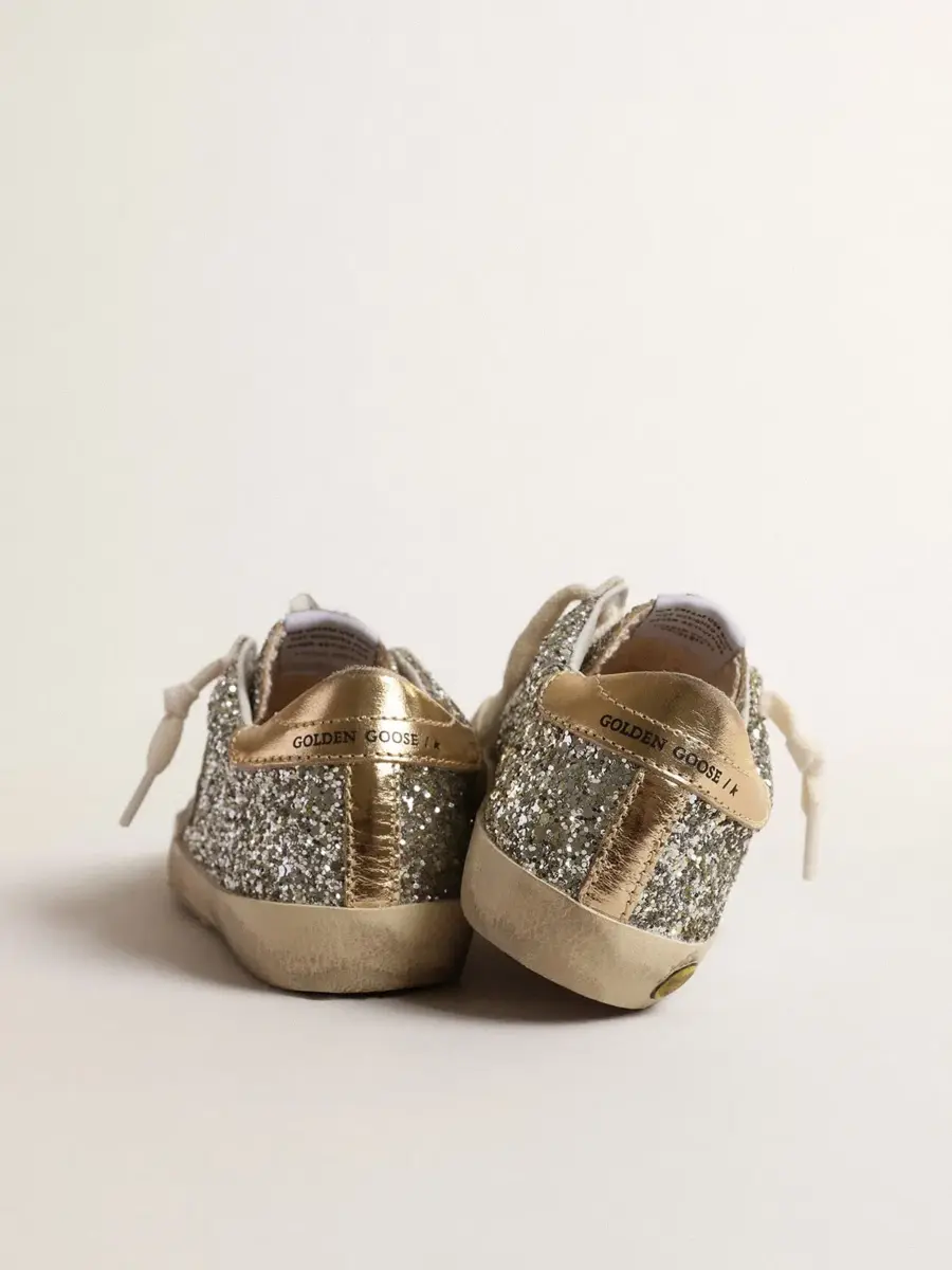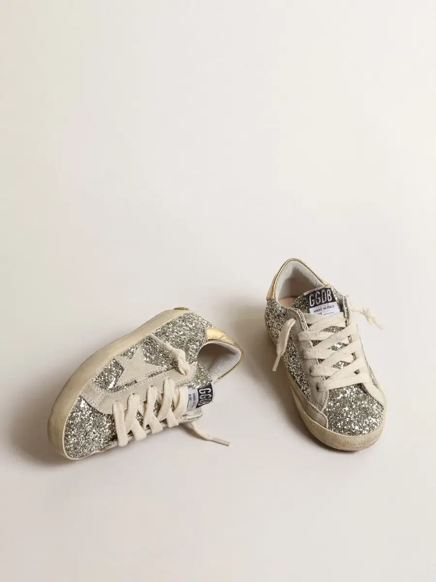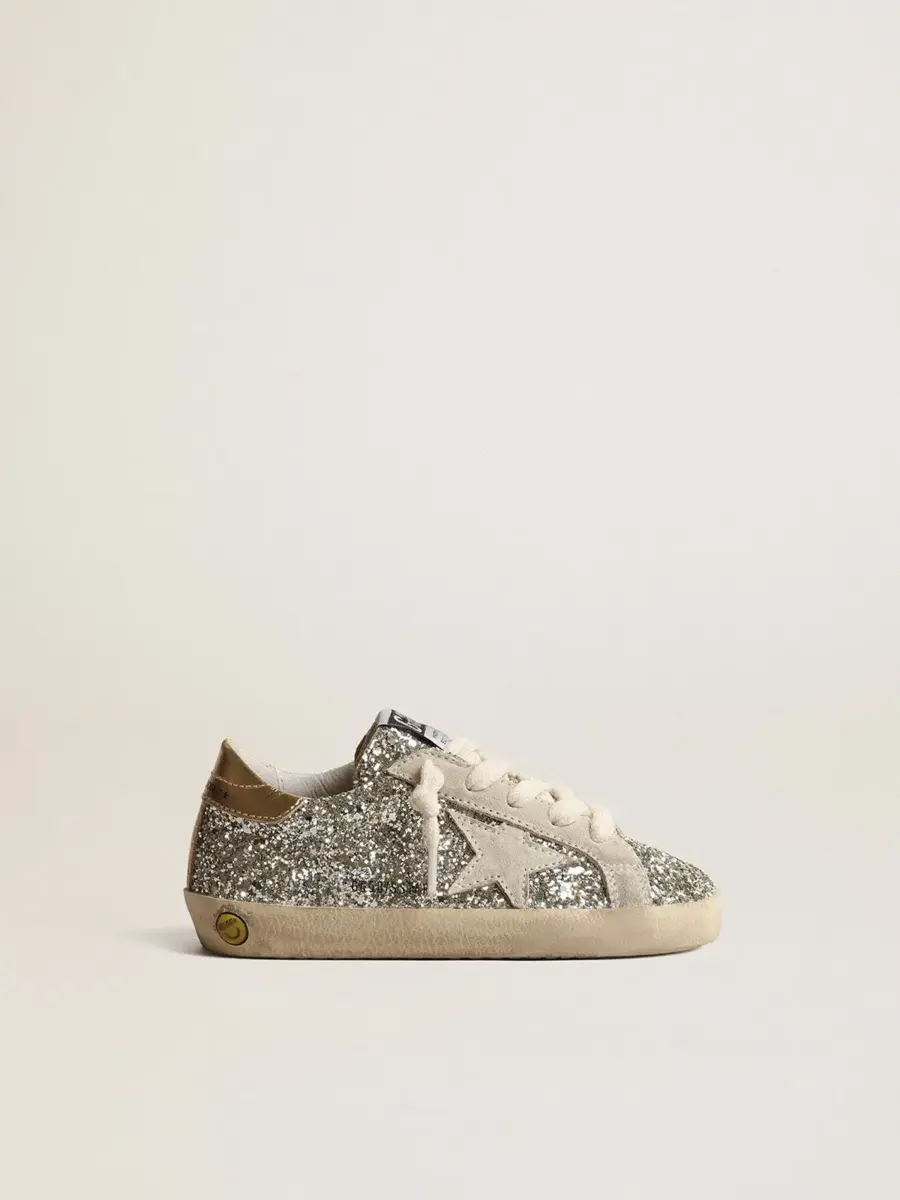 Un icono atemporal, pero en constante evolución. En Golden nos encanta retocar nuestros clásicos constantemente, siempre desde un nuevo ángulo. La versión Junior de estas Super-Star con parte superior brillante platino cuenta con una estrella de ante marfil y una lengüeta dorada metálica en el talón. Las inserciones de ante marfil, el detalle sonriente en el ribete y los cordones de color crema añaden el toque final.